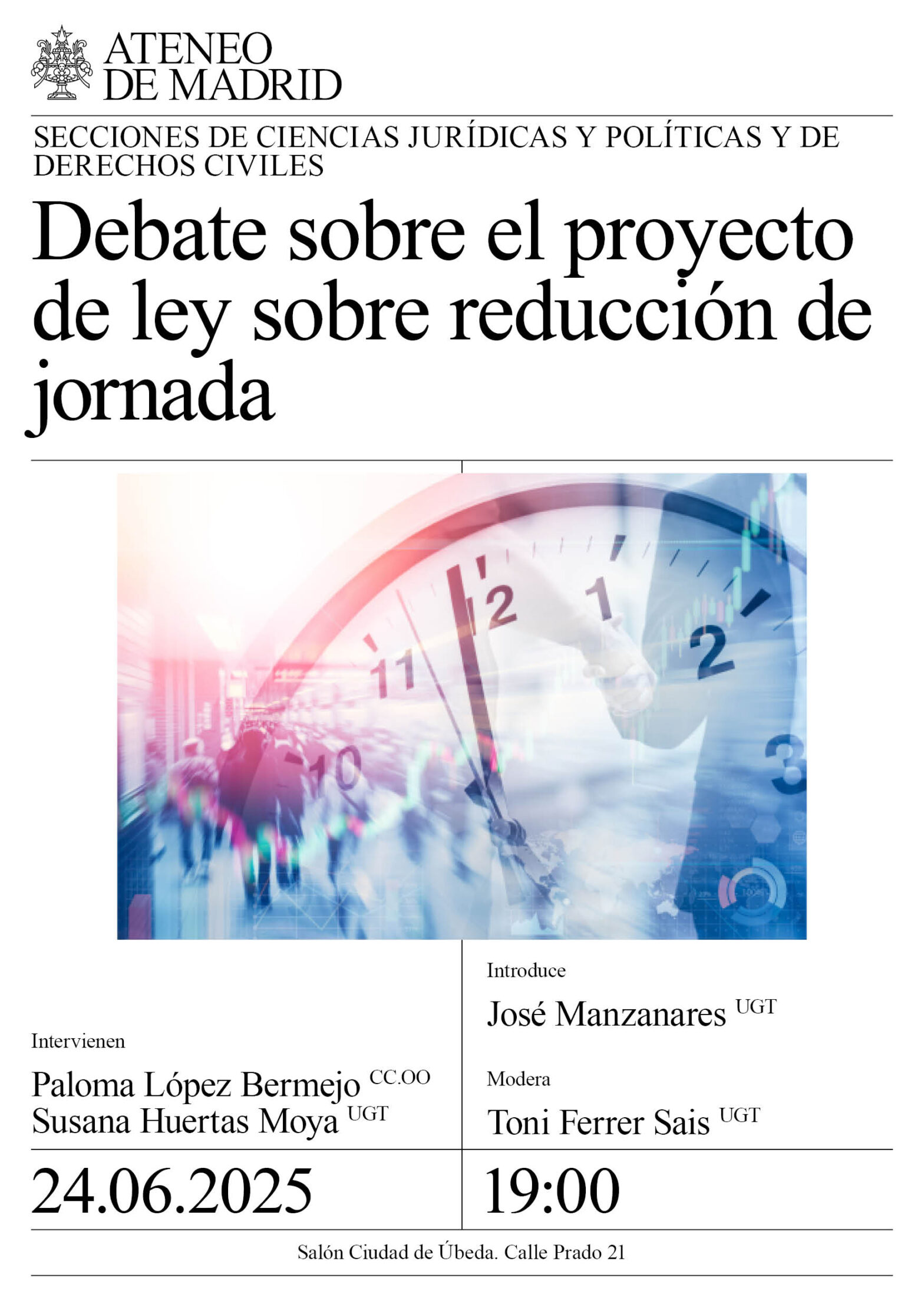 Secciones de Ciencias Jurídicas y Políticas y de Derechos Civiles. Intervienen: Paloma López Bermejo, secretaria general de CC.OO Madrid y exeurodiputada por Izquierda plural; Susana Huertas Moya, secretaria General de UGT Madrid, exsecretaria de Medio Ambiente y exsecretaria de Salud Laboral. Modera Toni Ferrer Sais, exsecretario de Acción Sindical Ej. Confederal UGT, exsecretario de Empleo de la Ej. Federal del PSOE, exsenador socialista en las XIII y XIV legislaturas, presidente de la Comisión de Trabajo y vicepresidente del Consejo Económico y Social de España. Introduce José Manzanares, Comisión Ej. Confederal UGT (1986-1994) exdirector Esc. Julián Besteiro-UGT, exdirector del Instituto Sindical Cooperación al Desarrollo ISCOD y Consejo Redacción Revista Argumentos Progresistas. Salón Ciudad de Úbeda. 19:00h.