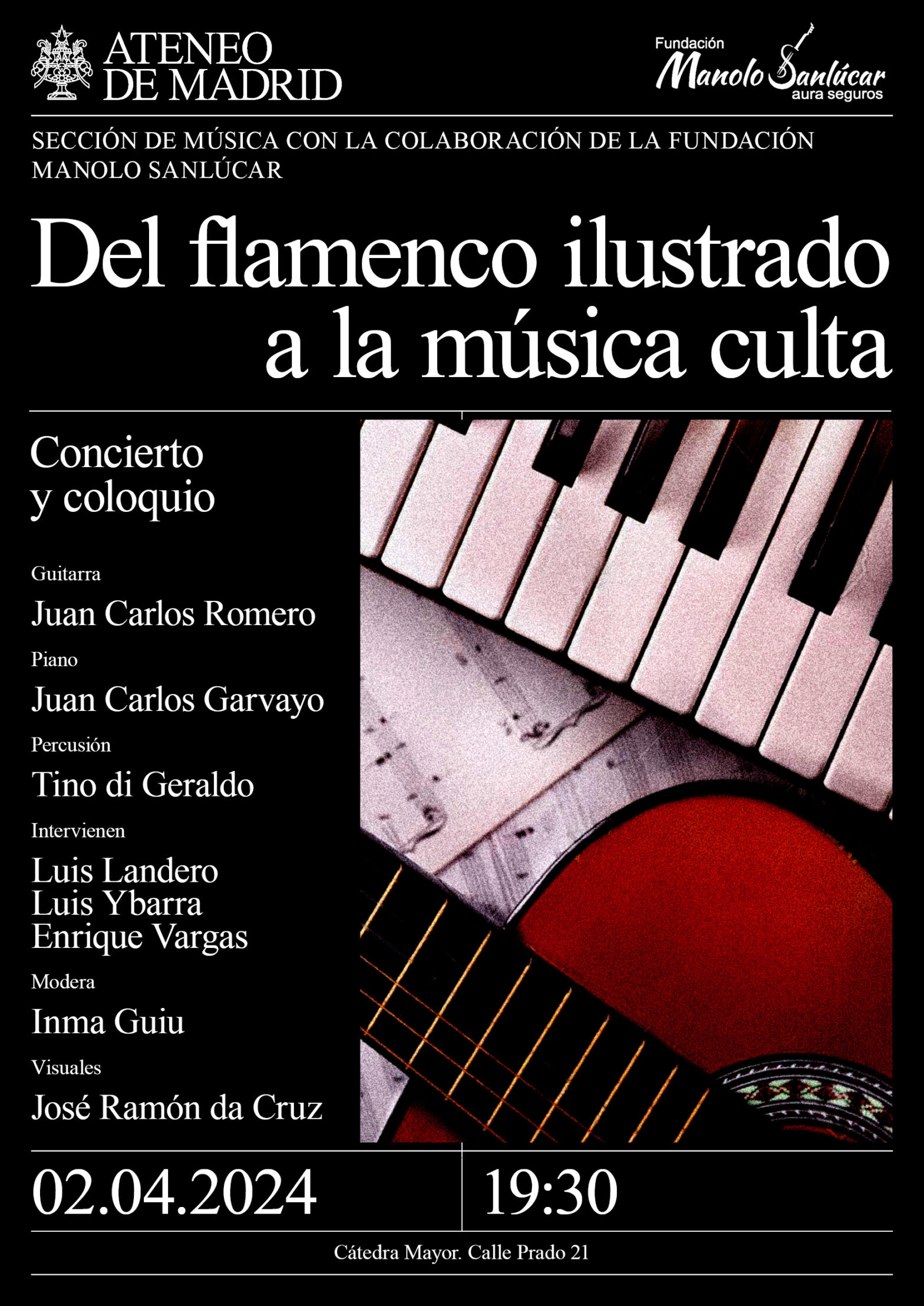 Sección de Música con la participación de la Fundación Manolo Sanlúcar. Colabora la Bienal de flamenco de Sevilla. Guitarra: Juan Carlos Romero. Piano: Juan Carlos Garvayo. Percusión: Tino di Geraldo. Intervienen: Luis Landero, Luis Ybarra, Enrique Vargas. Modera: Inma Guiu. Visuales: José Ramón da Cruz. Cátedra Mayor. 19:30h. Programa.
