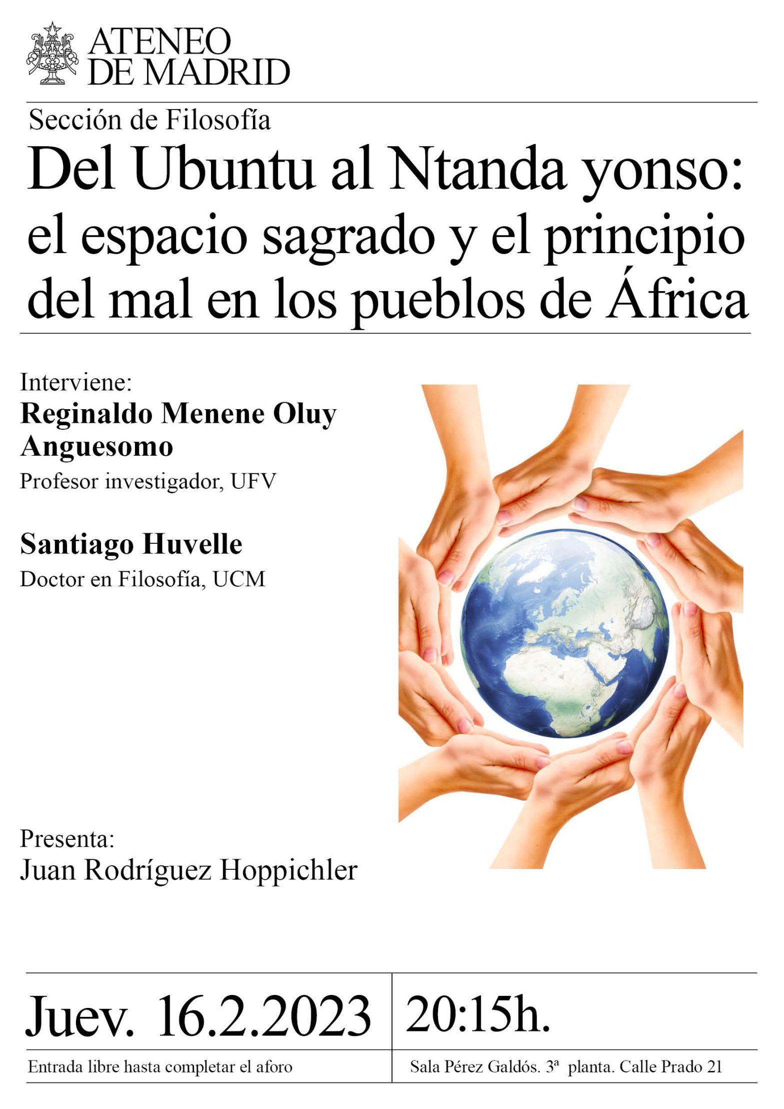 Sección de Filosofía. Intervienen: Reginaldo Menene Oluy Anguesomo, profesor investigador, UFV; Santiago Huvelle, doctor en Filosofía, UCM. Presenta Juan Rodríguez Hoppichler. Sala Pérez Galdós. 20:15h.