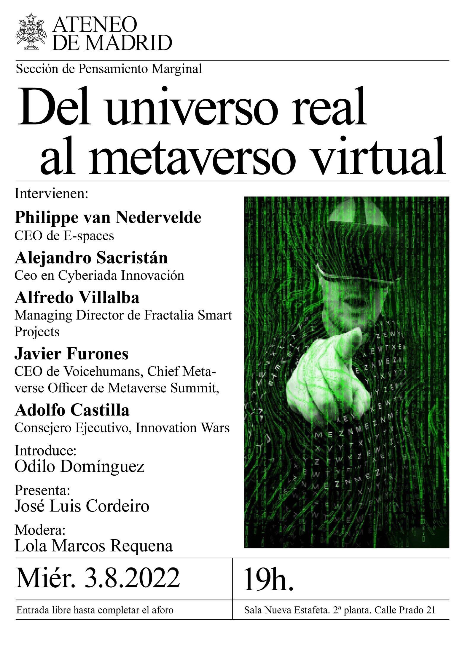 Sección de Pensamiento Marginal. Intervienen: Philippe van Nedervelde, Ceo de E-spaces; Alejandro Sacristán, Ceo de Cyberiada Innovación; Alfredo Villalba, Managing Director de Fractalia Smart Projects; Javier Furones, Ceo de Voicehumans, Chief Metaverse Officer de Metaverse Summit, Adolfo Castilla, consejero ejecutivo, Innovation Wars. Introduce Odilo Domínguez. Presenta José Luis Cordeiro. Modera Lola Marcos Requena. Sala Nueva Estafeta. 19 h.