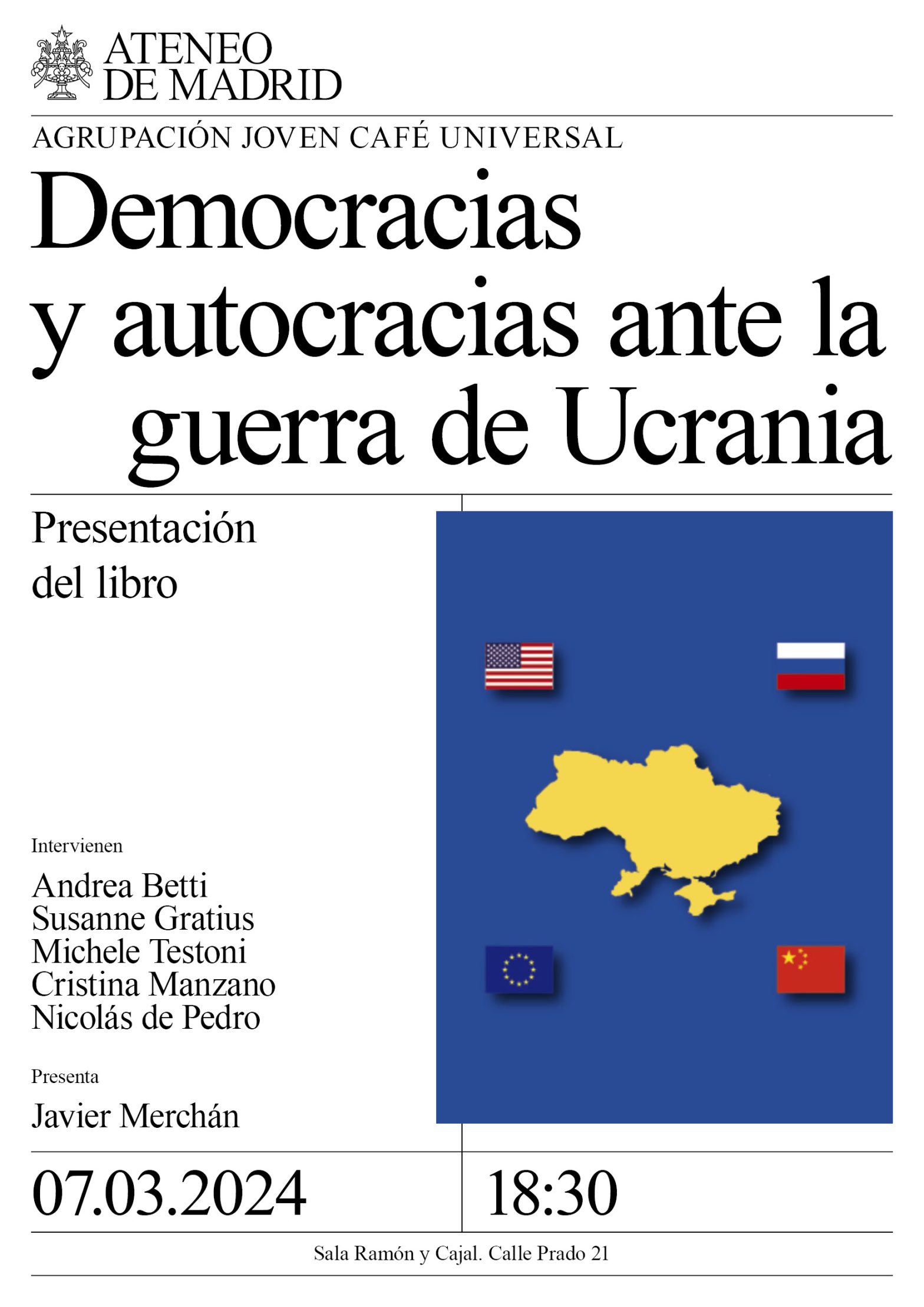 Agrupación Joven Café Universal. Intervienen: Andrea Betti, profesor Teoría de las Relaciones Internacionales, Departamento Relaciones Internacionales Universidad Pontificia Comillas. Susanne Gratius, profesora Teoría de las Relaciones Internacionales y Política Exterior Departamento Ciencia Política y Relaciones Internacionales, Universidad Autónoma de Madrid. Michele Testoni, profesor Relaciones Internacionales School of International Studies, IE University. Cristina Manzano, directora de Relaciones Externas de SEGIB (Secretaría General Iberoamericana) Nicolás de Pedro, profesor Geopolítica, Departamento Relaciones Internacionales, Universidad Pontificia Comillas y director de Estrategia Earendel Associates. Presenta: Javier Merchán. Sala Ramón y Cajal. 18:30h.