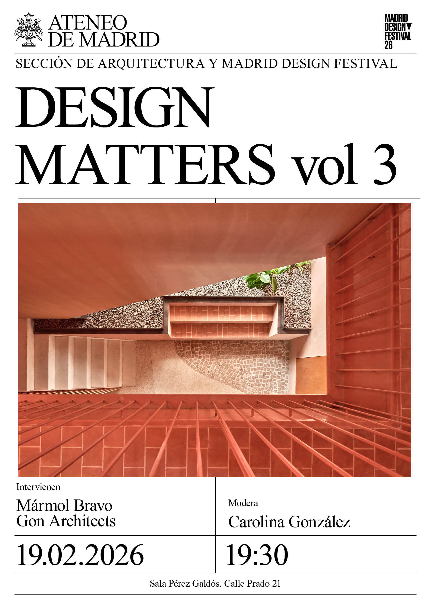 Sección de Arquitectura y Madrid Design Festival. Intervienen: Mármol Bravo y Gon Architects. Modera: Carolina González Vives. Sala Pérez Galdós. 19:30h.