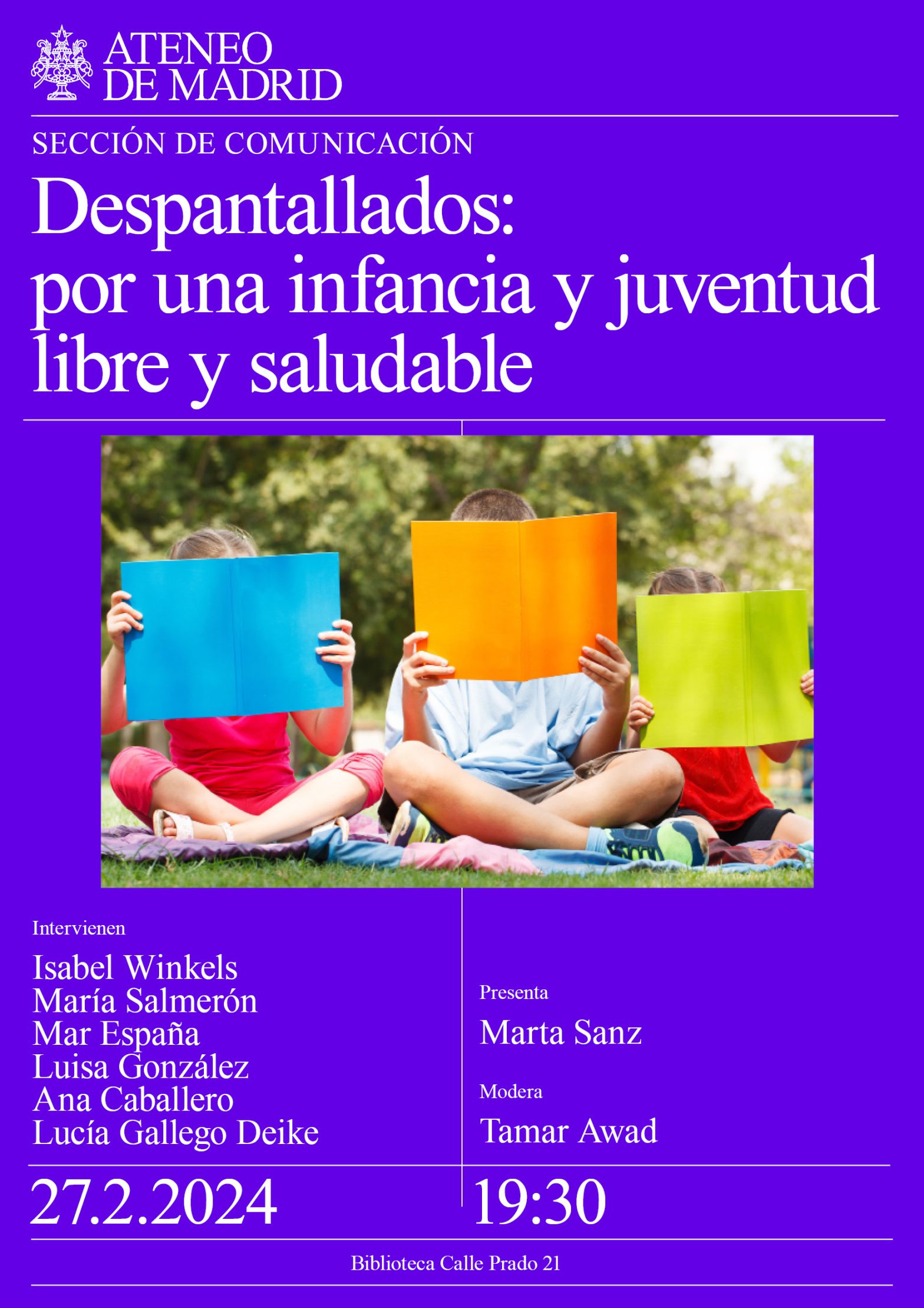 Sección de Comunicación. Intervienen: Isabel Winkels, vicedecana del Colegio de abogados de Madrid; María Salmerón, pediatra y especialista en Medicina de las adolescencias; Mar España, presidenta de la AEPD; Luisa González, presidenta de la Fundación Icomem y vicepresidenta del Colegio de Médicos de Madrid; Ana Caballero, abogada Sección infanto juvenil; Lucía Gallego Deike, psiquiatra. Presenta: Marta Sanz. Modera: Tamar Awad, aquitecta y docente. Biblioteca. 19:30h.