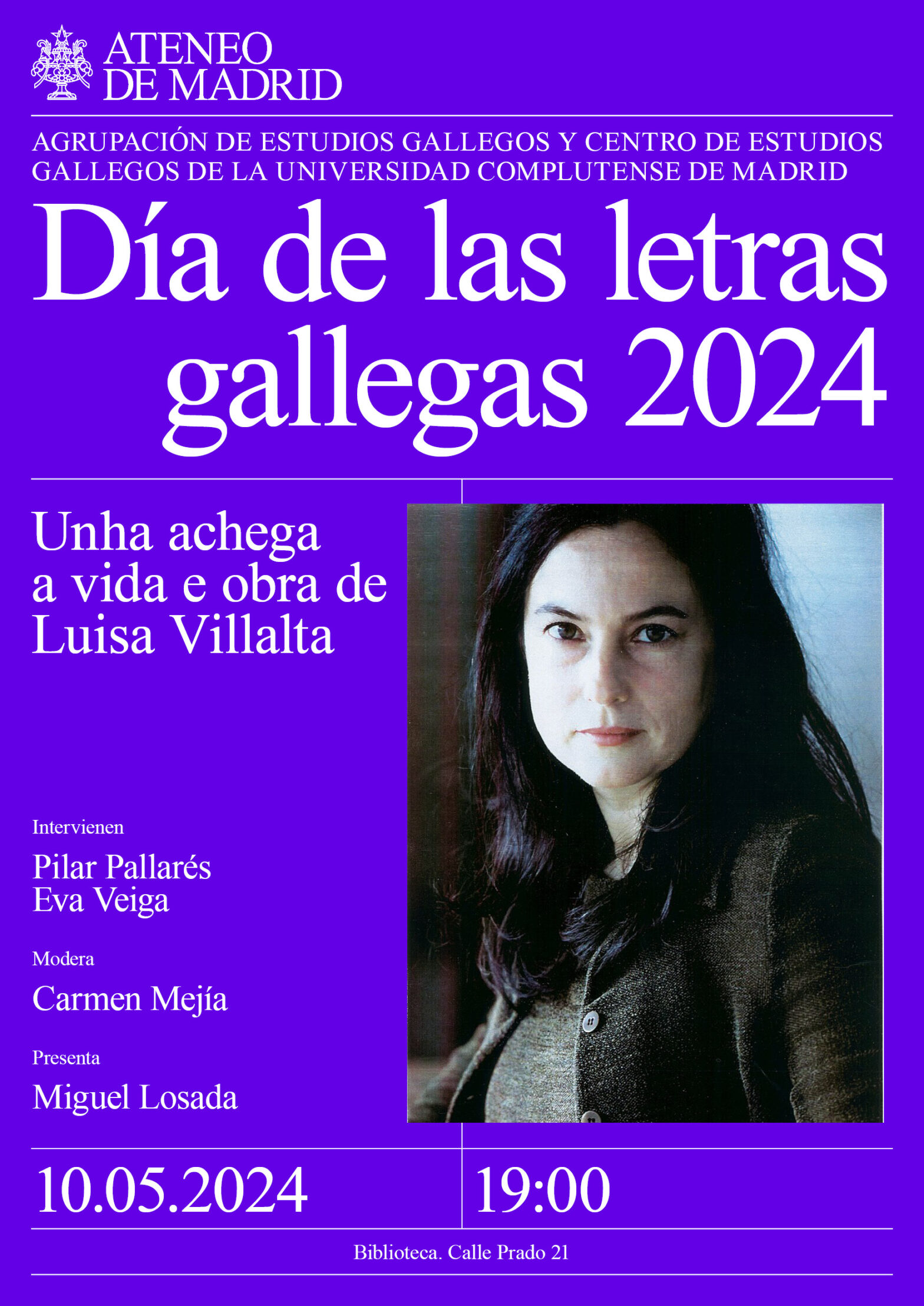 Agrupación de Estudios Gallegos y Centro de Estudios Gallegos de la Universidad Complutense de Madrid. Intervienen: Pilar Pallarés y Eva Veiga . Modera: Carmen Mejía, catedrática Universidad Complutense de Madrid y directora del CEG. Presenta Miguel Losada. Biblioteca. 19:00h.