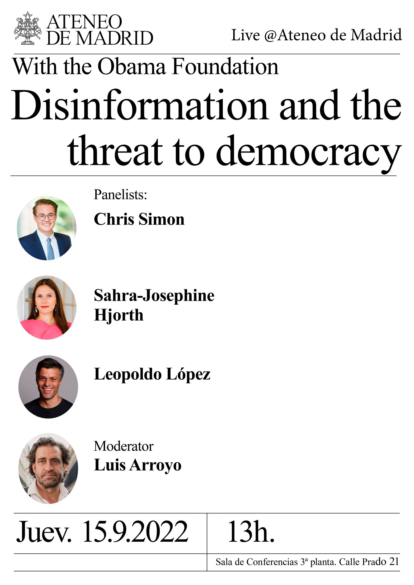 Panelists: Chris Simon, Sahra-Josephine Hjorth, Leopoldo López, with the Obama Foundation. Moderator Luis Arroyo. Live @Ateneo de Madrid