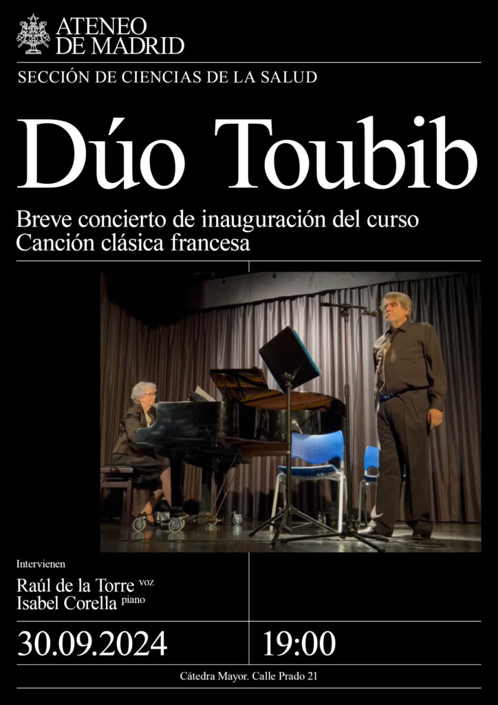 Sección de Ciencias de la Salud. 19:30h. Breve concierto de inauguración del curso de la Sección de Ciencias de la Salud. Canción clásica francesa. Intervienen: Raúl de la Torre, voz, e Isabel Corella, piano. Cátedra Mayor. 19:00h.