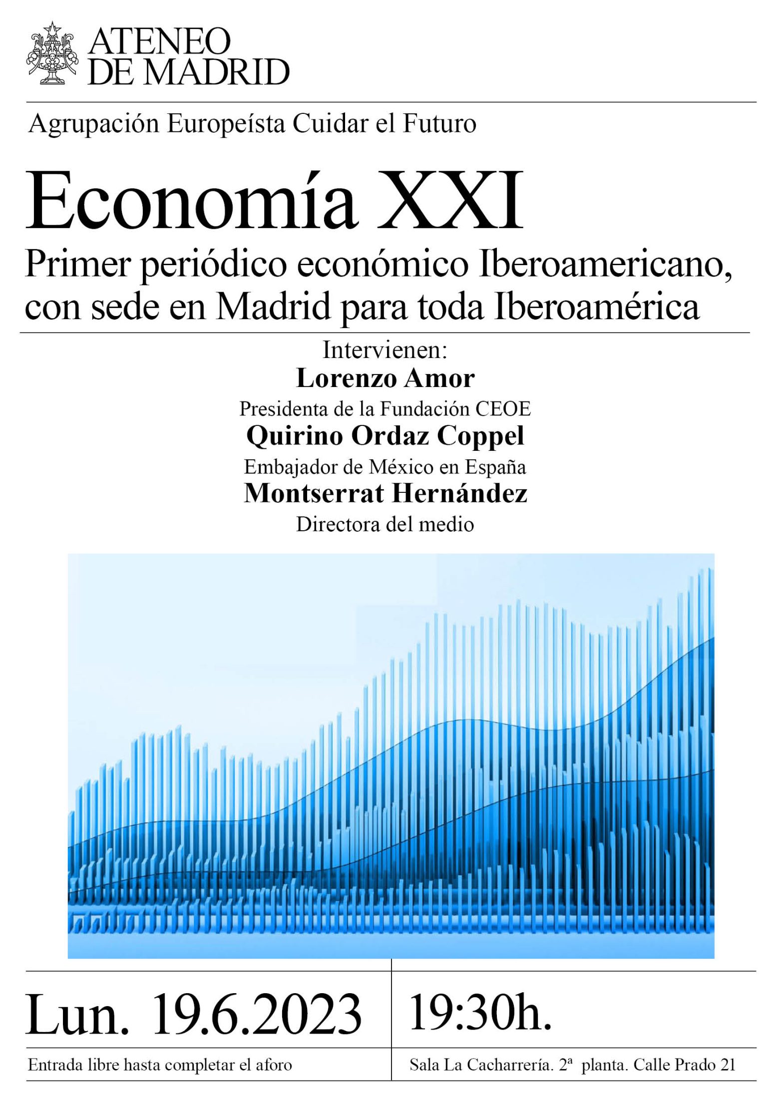 Primer periódico económico Iberoamericano, con sede en Madrid para toda Iberoamérica. Intervienen: Lorenzo Amor, autoridad empresarial; Quirino Ordaz Coppel, embajador de México en España; Montserrat Hernández, directora del medio. Sala La Cacharrería. 19:30h.