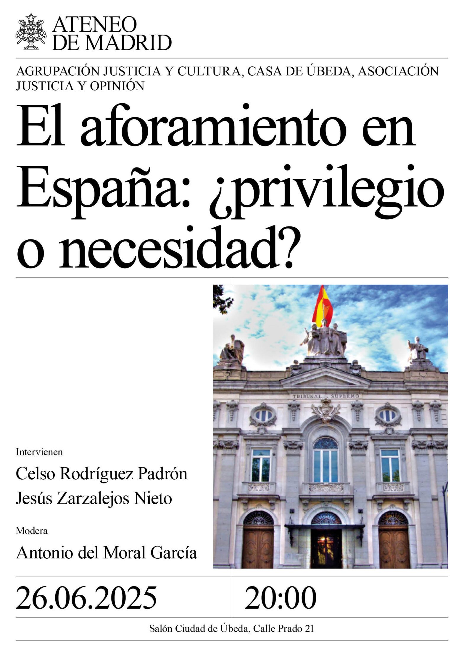 Agrupación Justicia y Cultura, Casa de Úbeda y Asociación Justicia y Opinión. Intervienen: Celso Rodríguez Padrón, magistrado, presidente del Tribunal Superior de Justicia de Madrid; Jesús Zarzalejos Nieto, abogado, profesor de Derecho Procesal en CUNEF Universidad. Modera: Antonio del Moral García, magistrado de la Sala Penal del Tribunal Supremo, vicepresidente de la Asociación. Salón Ciudad de Úbeda. 20:00h.