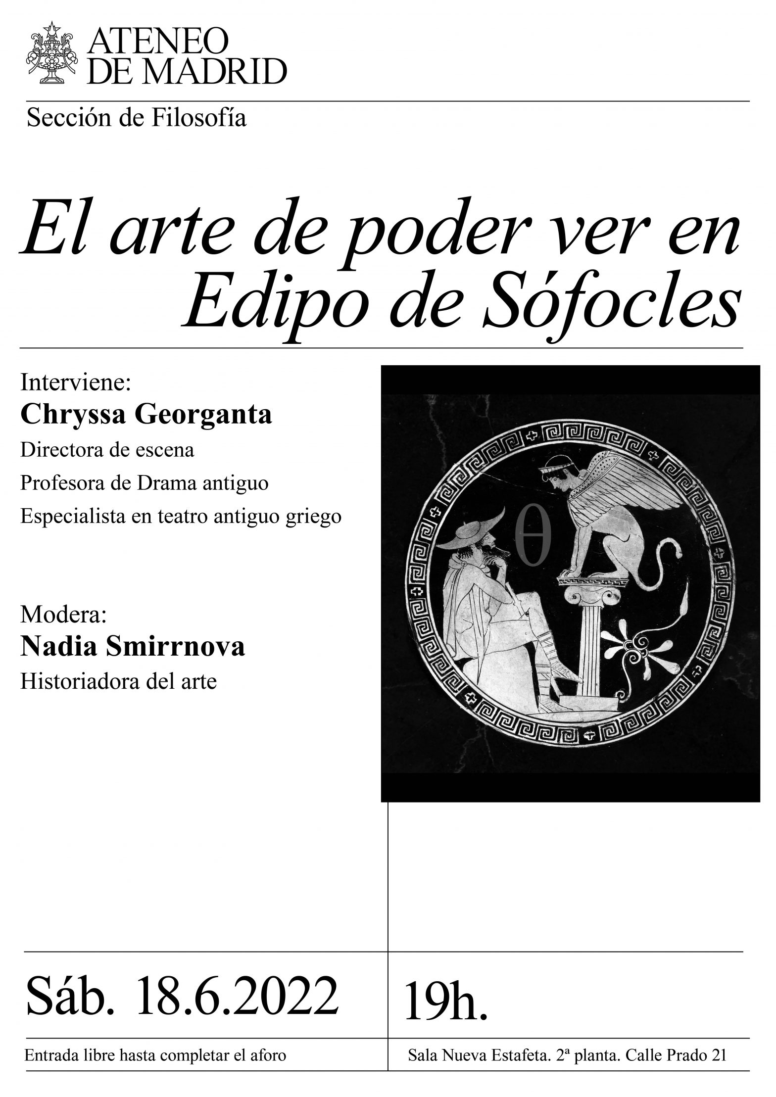 Sección de Filosofía. Interviene Chryssa Georganta, directora de escena, profesora de drama antiguo. Modera Nadia Smirrnova. Sala Nueva Estafeta. 19 h.