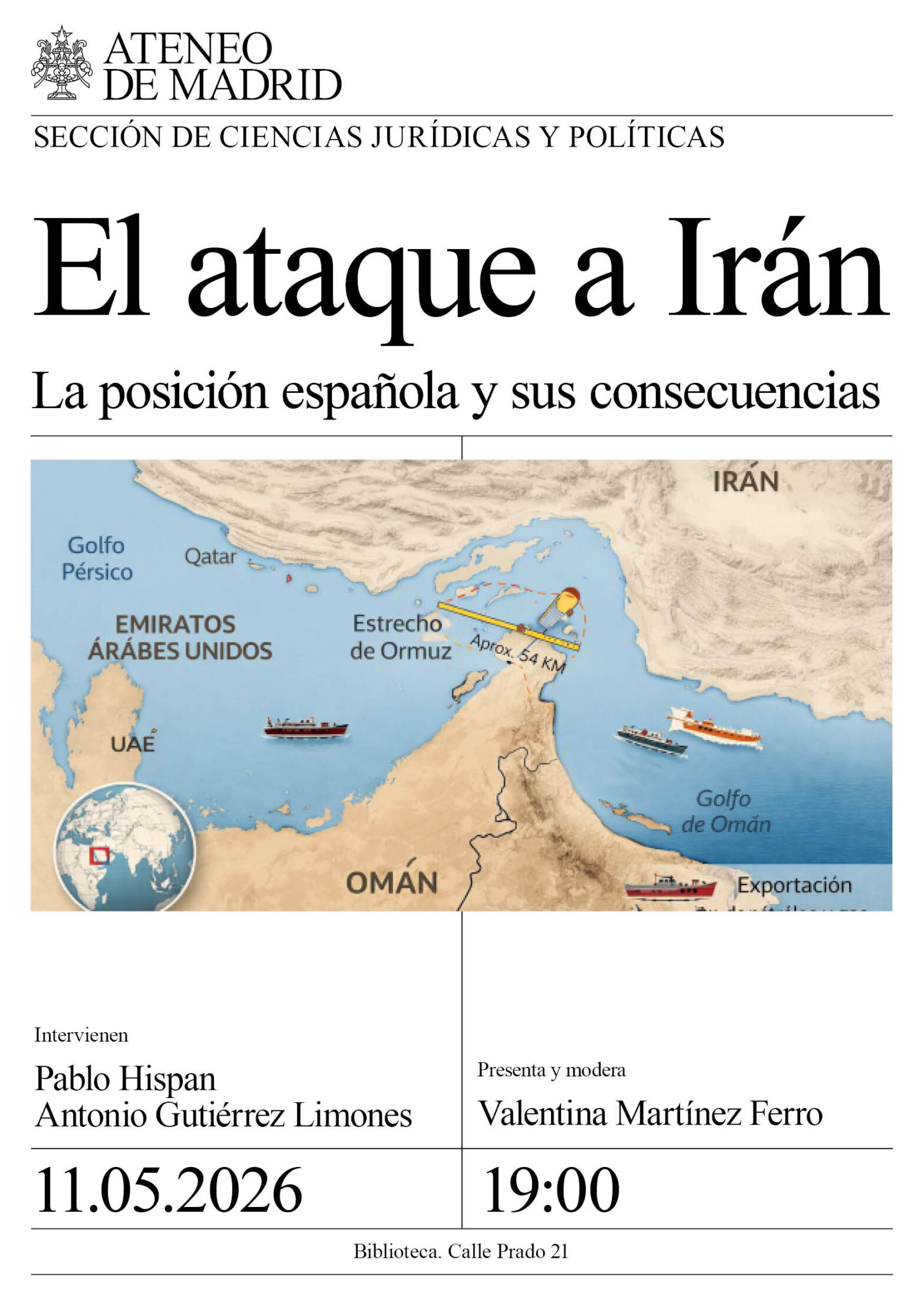 Sección de Ciencias Jurídicas y Políticas. Intervienen: Pablo Hispan, diputado PP y presidente del Grupo PPE en la Asamblea Parlamentaria del Consejo de Europa Antonio Gutierrez Limones, Senador del PSOE y presidente de la Delegación Española en la Asamblea Parlamentaria del Consejo de Europa. Modera y presenta: Valentina Martínez Ferro. Biblioteca. 20:00h.