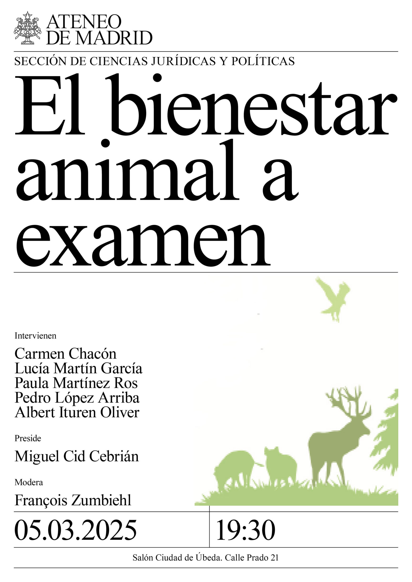Sección de Ciencias Jurídicas y Políticas. Intervienen: Carmen Chacón, economista, ganadera y gestora de coto de caza; Lucía Martín García, directora de Relaciones Institucionales de la RUCTL; Paula Martínez Ros, doctora en Veterinaria y especialista en espectáculos taurinos; Pedro López Arriba, jurista; y Albert Ituren Oliver, profesor del Departamento de Derecho Administrativo y Procesal de la Universidad de Valencia. Preside Miguel Cid Cebrián. Modera François Zumbiehl. Salón Ciudad de Úbeda. 19:30h.
