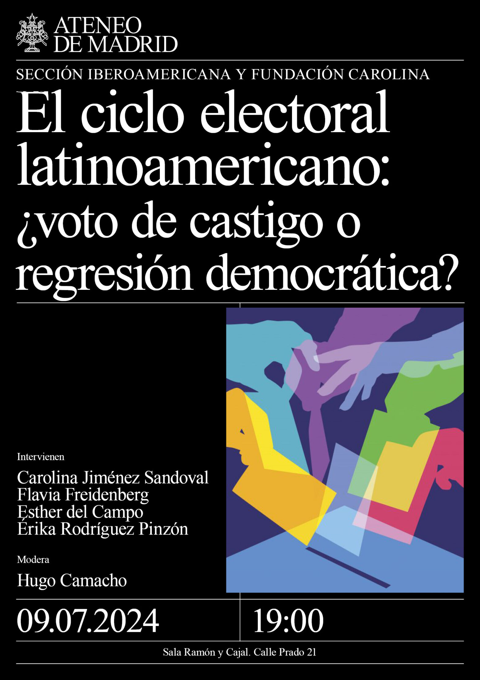 Sección Iberoamericana. Intervienen: Carolina Jiménez Sandoval, presidenta de la Oficina en Washington para Asuntos Latinoamericano (WOLA); Flavia Freidenberg, politóloga e investigadora del Instituto de Investigaciones Jurídicas de la Universidad Nacional Autónoma de México; Esther del Campo, decana de la Facultad de Ciencias Políticas y Sociología de la UCM; y Érika Rodríguez Pinzón, directora de la Fundación Carolina. Modera: Hugo Camacho. Sala Ramón y Cajal. 19:00h.