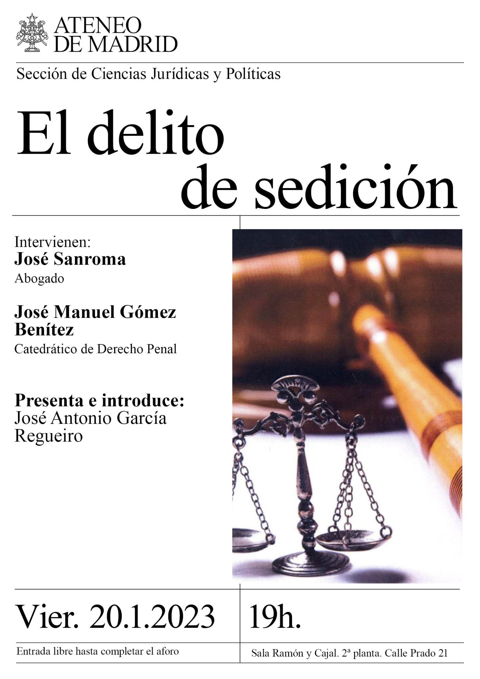 Sección de Ciencias Jurídicas y Políticas. Intervienen: José Sanroma, abogado, Interviene: José Manuel Gómez Benítez, Catedrático de Derecho Penal. Presenta: José Antonio García Regueiro. Sala Ramón y Cajal. 19h.
