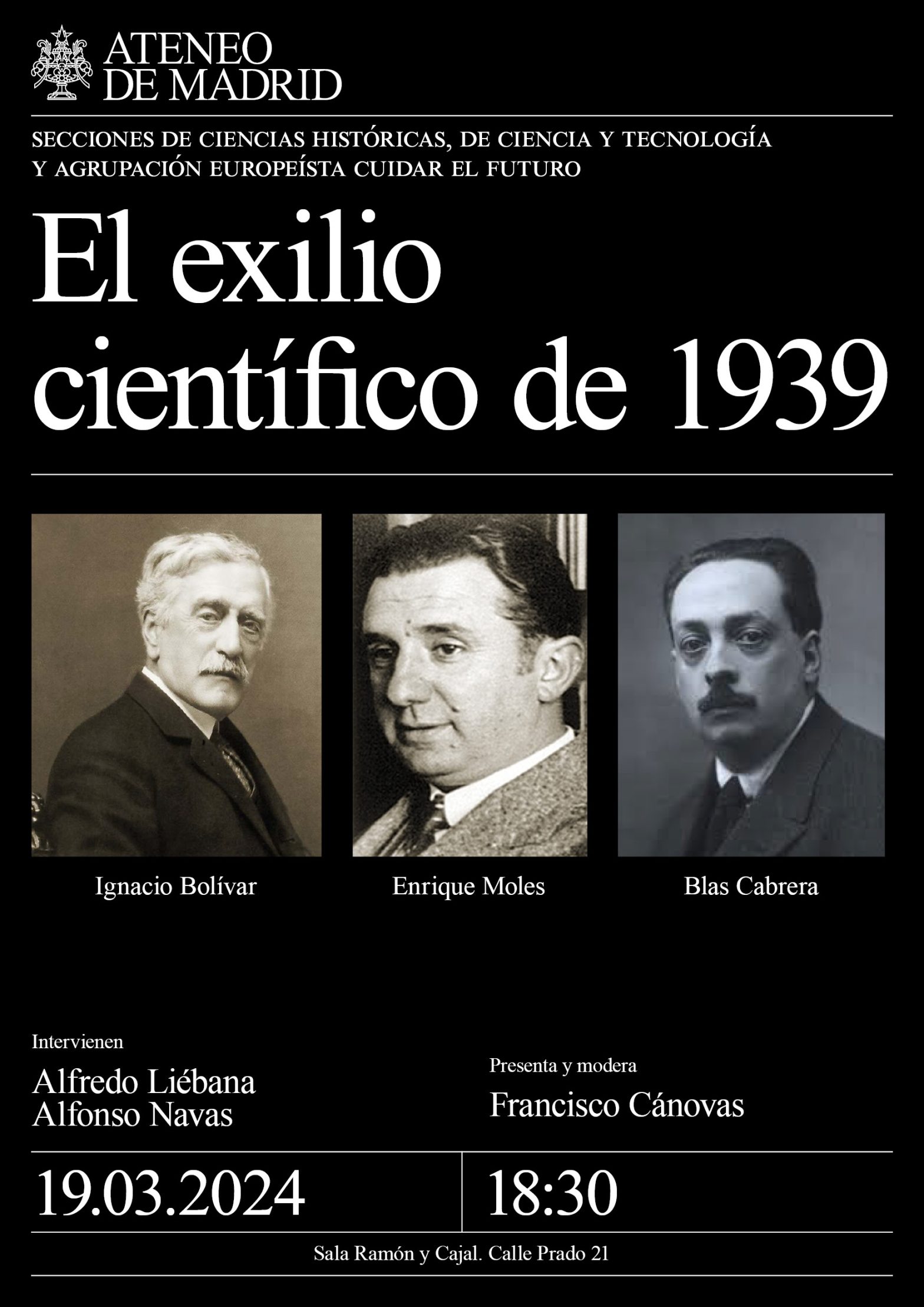 Secciones de Ciencias Históricas, de Ciencia y Tecnología y Agrupación Europeísta Cuidar el Futuro. Intervienen: Alfredo Liébana, profesor y divulgador de Historia y Ciencia. Alfonso Navas, investigador del CSIC y exdirector del Museo de Ciencias Naturales. Presenta y modera: Francisco Cánovas. Sala Ramón y Cajal. 18:30h.