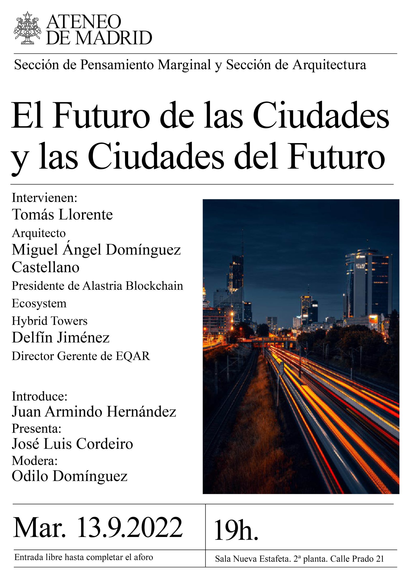 Sección de Pensamiento Marginal y Sección de Arquitectura.Tomás Llorente, Arquitecto, Administración Pública, Miguel Angel Domínguez Castellano, Presidente de Alastria Blockchain Ecosystem, Delfín Jiménez, director gerente de EQAR, Urbanismo Edificación y Accesibilidad, Introduce Juan Armindo Hernández. Presenta José Luis Cordeiro. Modera Odilo Domínguez. Sala Nueva Estafeta. 19h.