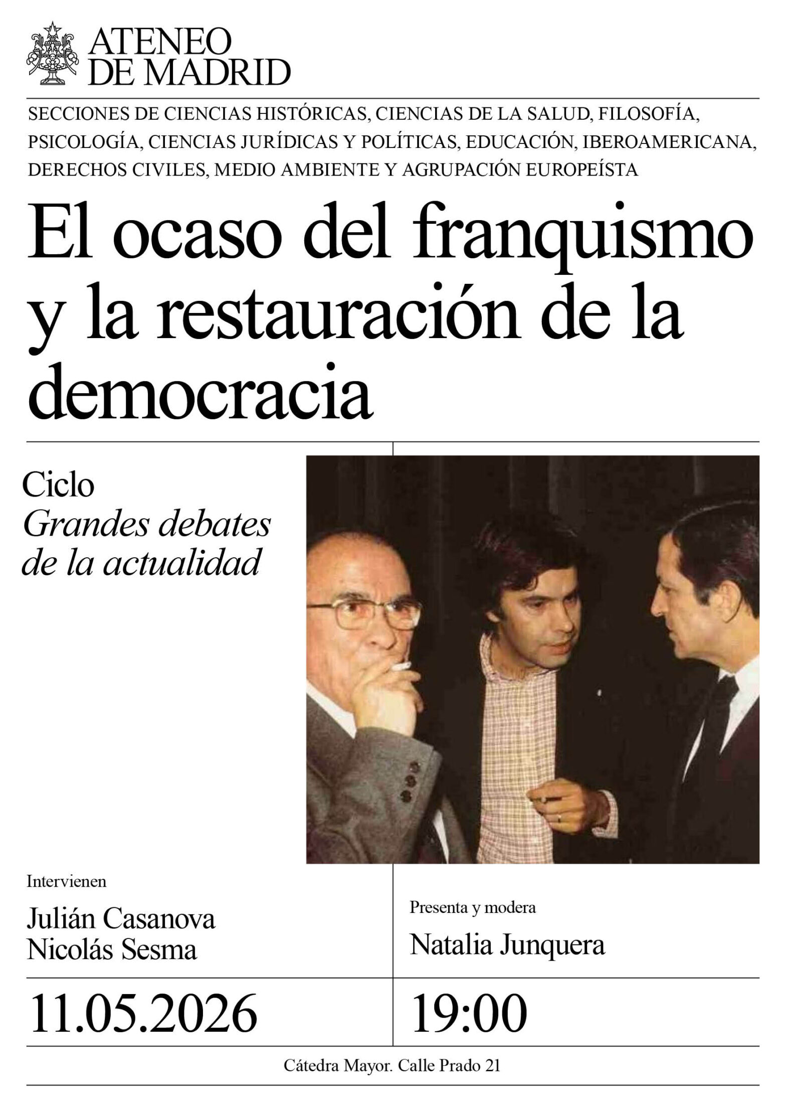 Secciones de Ciencias Históricas, Ciencias de la Salud, Filosofía, Psicología, Ciencias Jurídicas y Políticas, Educación, Iberoamericana, Derechos Civiles, Medio Ambiente y Agrupación Europeísta. Intervienen: Julián Casanova y Nicolás Sesma. Presenta y modera: Natalia Junquera. Cátedra Mayor. 19:00h.