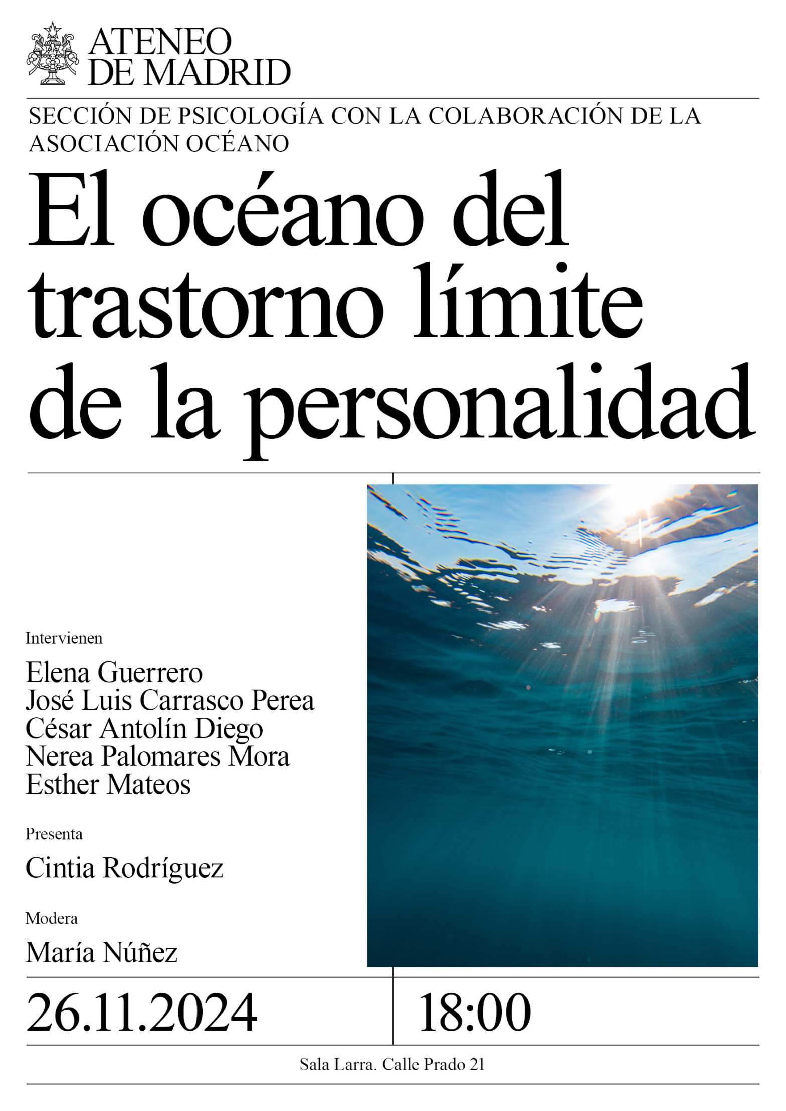Sección de Psicología con la colaboración de la Asociación Océano. Intervienen: Elena Guerrero, José Luis Carrasco Perea, César Antolín Diego, Nerea Palomares Mora, Esther Mateos. Presenta: Cintia Rodríguez. Modera: María Núñez. Sala Larra. 18:00h.