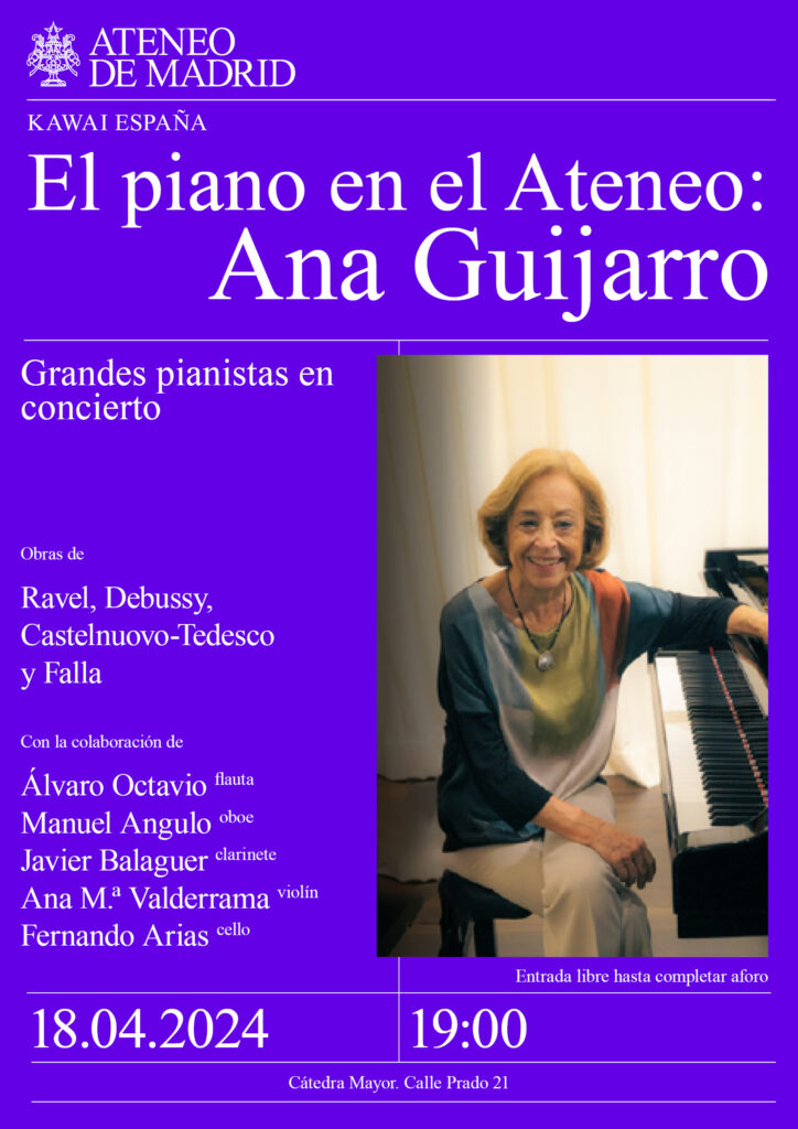 Grandes pianistas en concierto. Obras de Ravel, Debussy, Castelnuovo-Tedesco y Falla. Con la colaboración de Álvaro Octavio (flauta), Manuel Angulo (oboe), Javier Balaguer (clarinete), Ana M.ª Valderrama (violín) y Fernando Arias (cello). Cátedra Mayor. 19:00h.