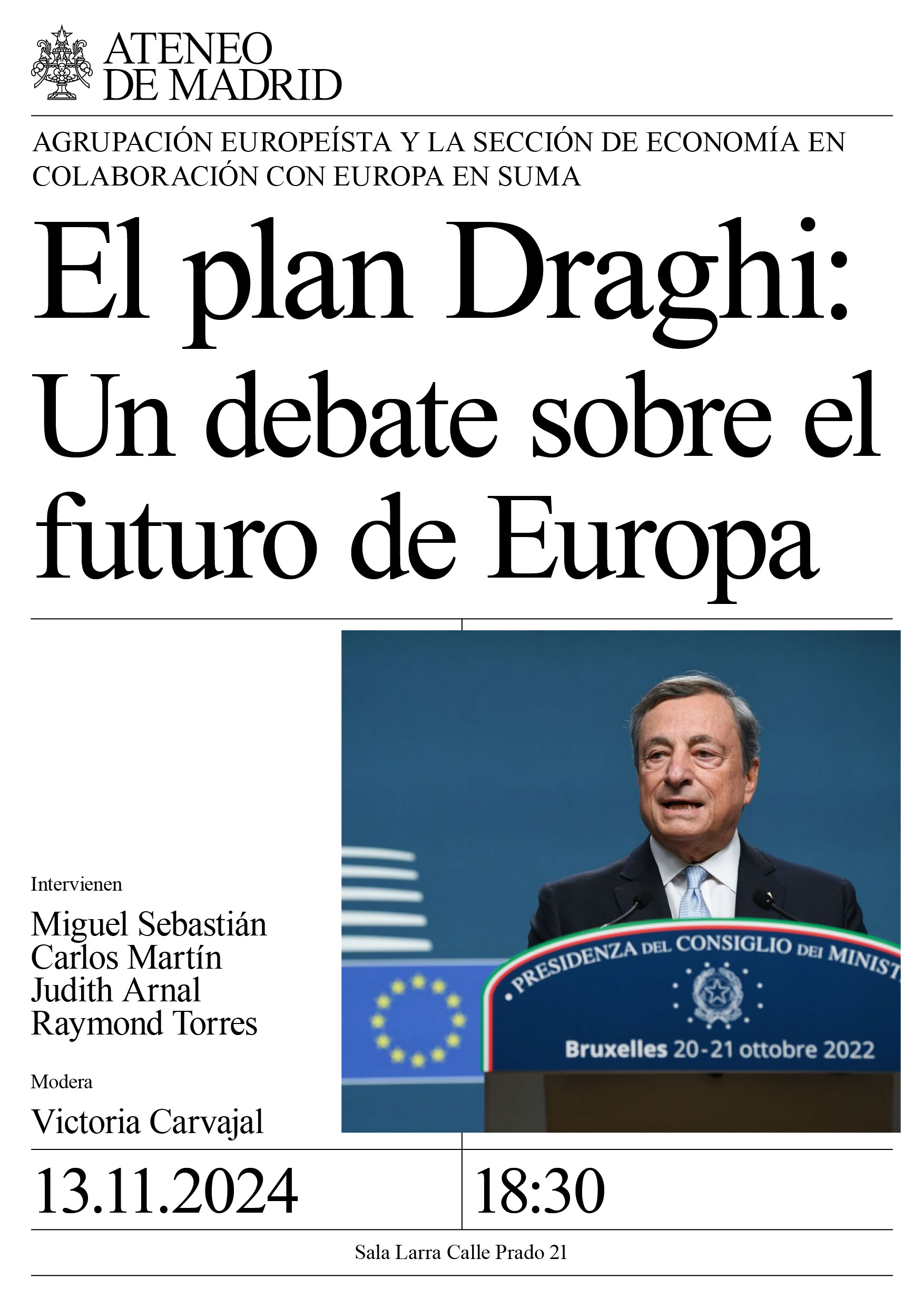 Agrupación europeísta Cuidar el Futuro, Sección de Economía del Ateneo y Europa en suma. Intervienen: Miguel Sebastián, exministro de Industria, profesor de Economía UCM; Carlos Martín, diputado, exdirector del Gabinete Económico de CC.OO; Judith Arnal, investigadora principal del CEPS y del Instituto Elcano; y Raymond Torres, director del Observatorio FUNCAS EUROPE. Modera: Victoria Carvajal, periodista. Sala Larra. 18:30h.