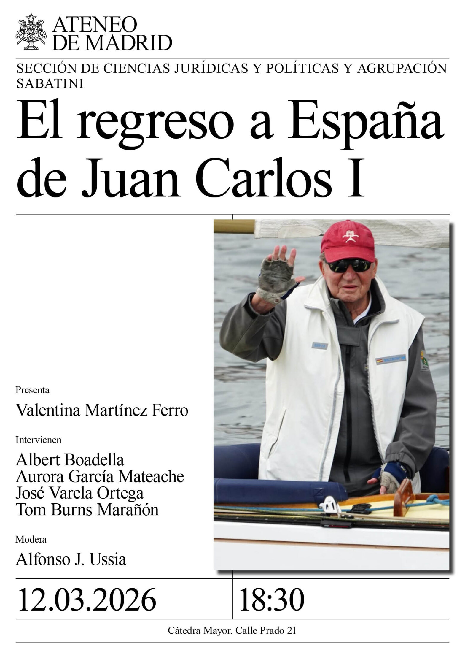 Sección de Ciencias Jurídicas y Políticas y Agrupación Sabatini. Presenta: Valentina Martínez Ferro. Intervienen: Albert Boadella, dramaturgo; Aurora García Mateache, periodista y novelista; José Varela Ortega, catedrático de Historia en la Universidad Juan Carlos I; y Tom Burns Marañón, autor del libro El legado de Juan Carlos I. Modera: Alfonso J. Ussia. Cátedra Mayor. 18:30h.