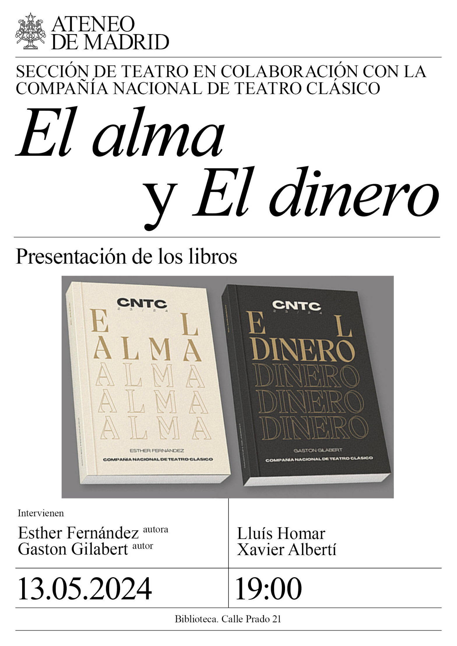 Sección de Teatro en colaboración con la Compañía Nacional de Teatro Clásico. Intervienen: Esther Fernández, autora de El alma; Gaston Gilabert, autor de El dinero; Lluís Homar, director de la Compañía Nacional de Teatro Clásico; y Xavier Albertí, dramaturgo de la Compañía Nacional de Teatro Clásico. Biblioteca. 19:00h.