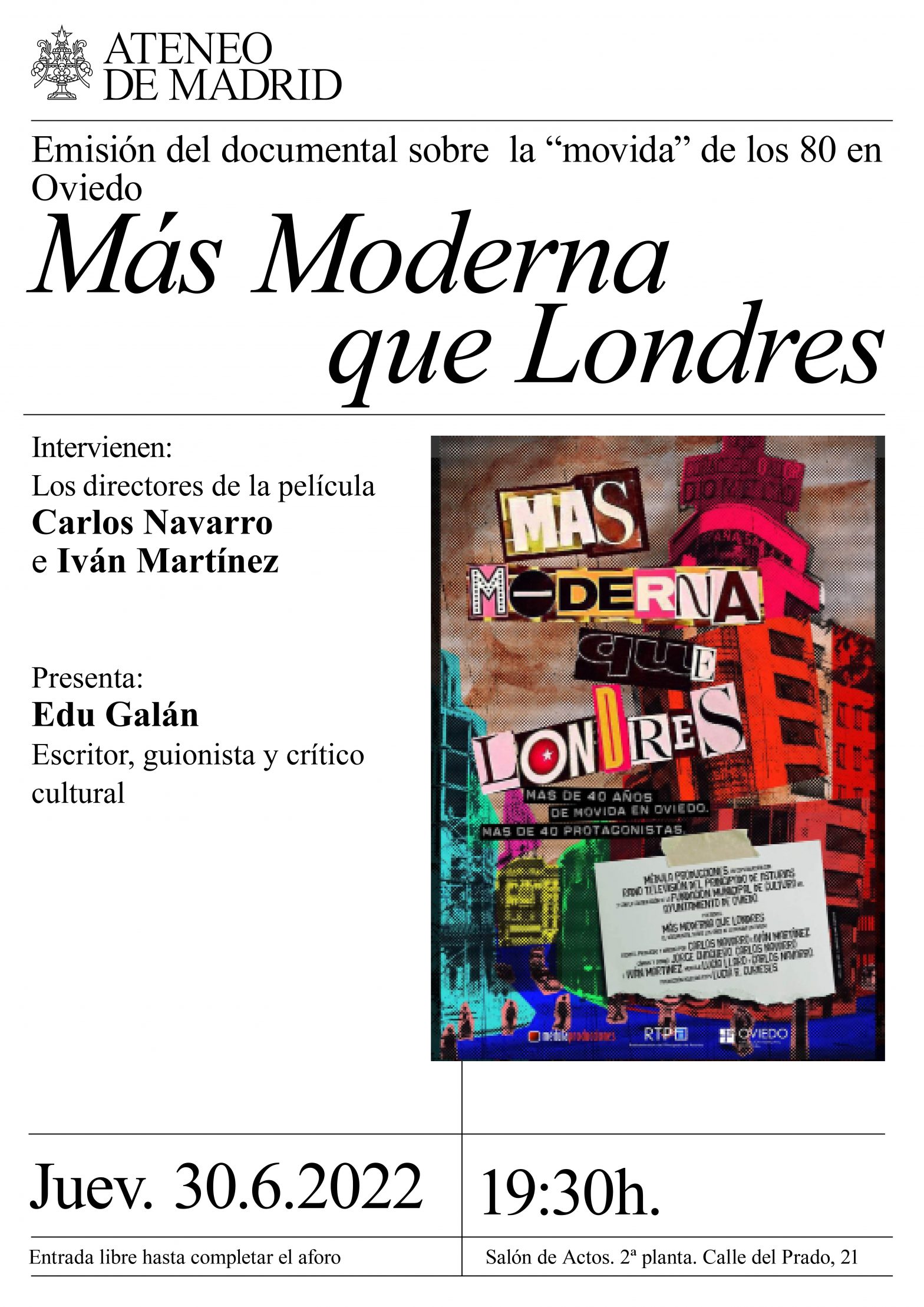 Sección de Música. Más moderna que Londres, el documental sobre los años ochenta en Oviedo. Intervienen los directores de la película Iván Martínez y Carlos Navarro. Presenta Edu Galán, escritor, guionista y crítico cultural. Salón de Actos.