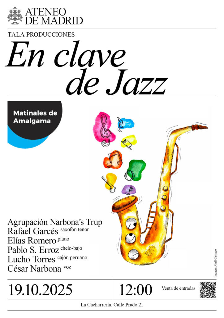 Tala Producciones. Agrupación: Narbona’s Trup. Rafael Garcés, saxofón tenor; Elías Romero, piano; Pablo S. Erroz, chelo-bajo; Lucho Torres, cajón peruano; y César Narbona, voz. La Cacharrería. 12:00h.