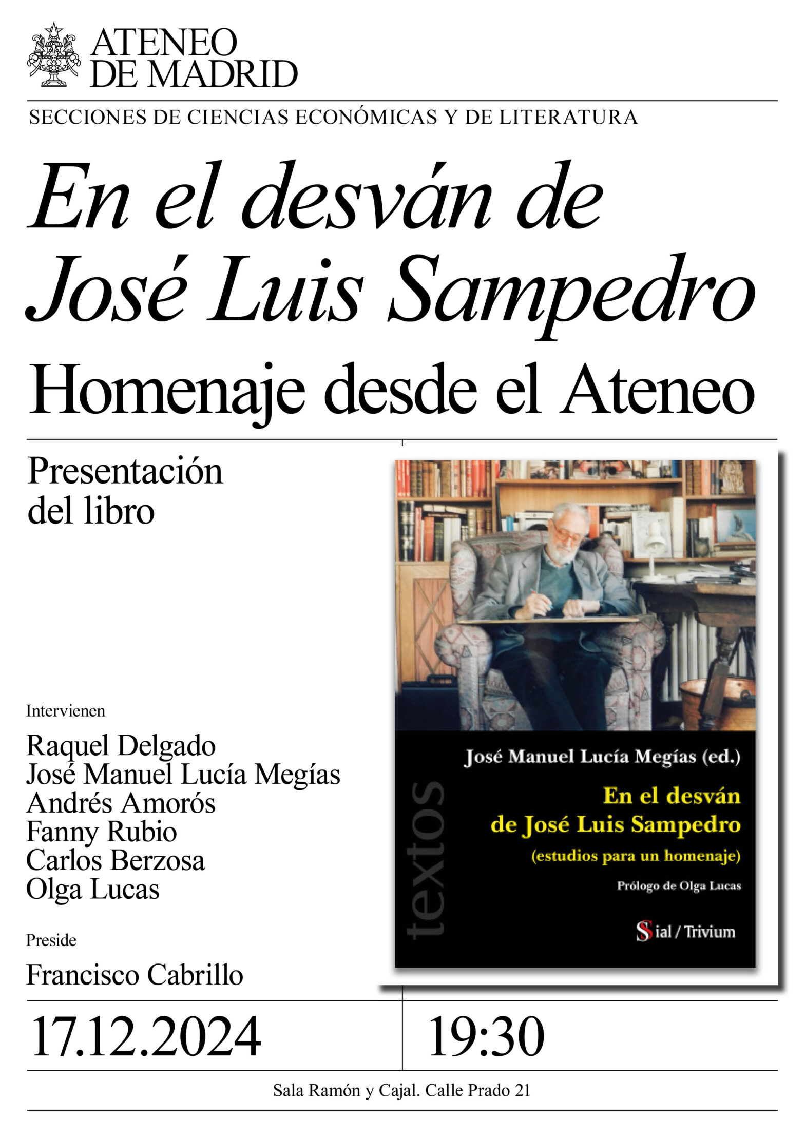 Secciones de Ciencias Económicas y de Literatura. Intervienen: Raquel Delgado, editora de Sial/Pigmalión; José Manuel Lucía Megías, escritor, profesor y editor del libro; Andrés Amorós, escritor y profesor; Fanny Rubio, escritora y profesora; Carlos Berzosa, economista y profesor; y Olga Lucas, escritora. Preside: Francisco Cabrillo. Sala Ramón y Cajal. 19:30h.