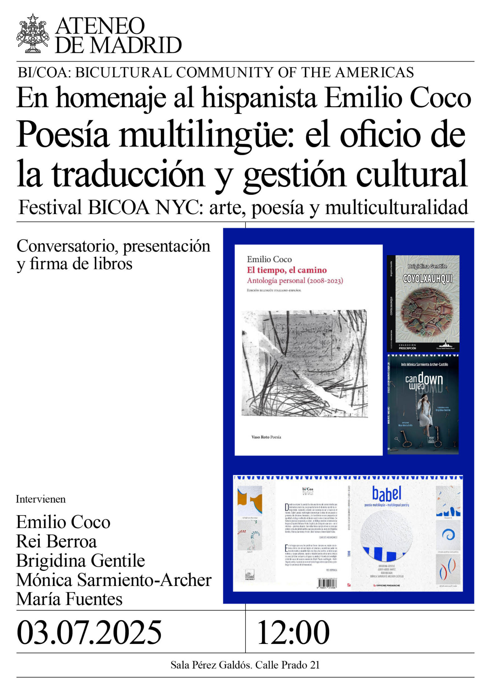 Este encuentro en torno a uno de los hispanistas más importantes de nuestro tiempo Emilio Coco, reflexiona sobre el oficio de poetas que hacen gestión cultural y cuya labor tras bastidores es esencial para proyectar la poesía española e hispanoamericana. Este evento forma parte del ciclo internacional de presentaciones de bi/Coa: Bicultural Community of the Americas. NYC. Como parte de los actos tendremos: firma de libros: El tiempo, el camino antología personal editado por Vaso Roto. Presentación de Coyolxauhqui, colección Proscritos (Nueva York Poetry Press); Can Down/Calm down y Babel: poesía multilingüe en español, inglés, italiano y árabe (Editorial Officine Pindariche).