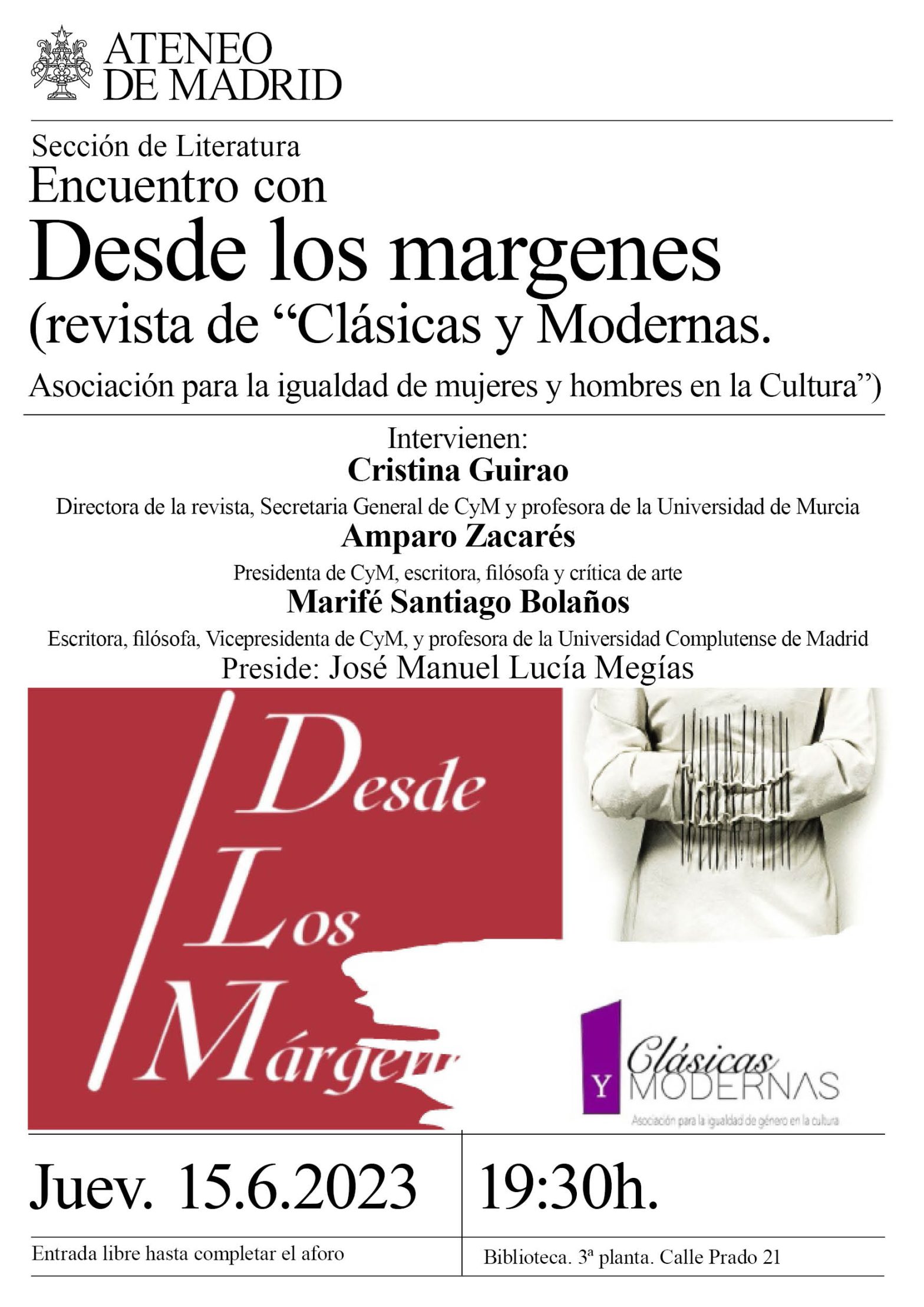 Sección de Literatura. Intervienen: Cristina Guirao, directora de la revista, Secretaria General de CyM y profesora de la Universidad de Murcia; Amparo Zacarés, presidenta de CyM, escritora, filósofa y crítica de arte; Marifé Santiago Bolaños, escritora, filósofa, Vicepresidenta de CyM, y profesora de la Universidad Complutense de Madrid. Preside: José Manuel Lucía Megías. Biblioteca. 19:30h.