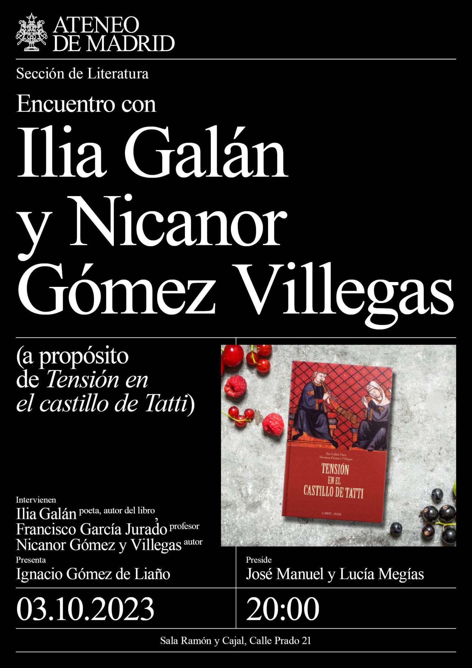 Sección de Literatura. Participantes: Ilia Galán, profesor, poeta y autor del libro. Nicanor Gómez Villegas, escritor y autor del libro. Francisco García Jurado, profesor. Presenta: Ignacio Gómez de Liaño. Preside: José Manuel Lucía Megías. 20h. Sala Ramón y Cajal.