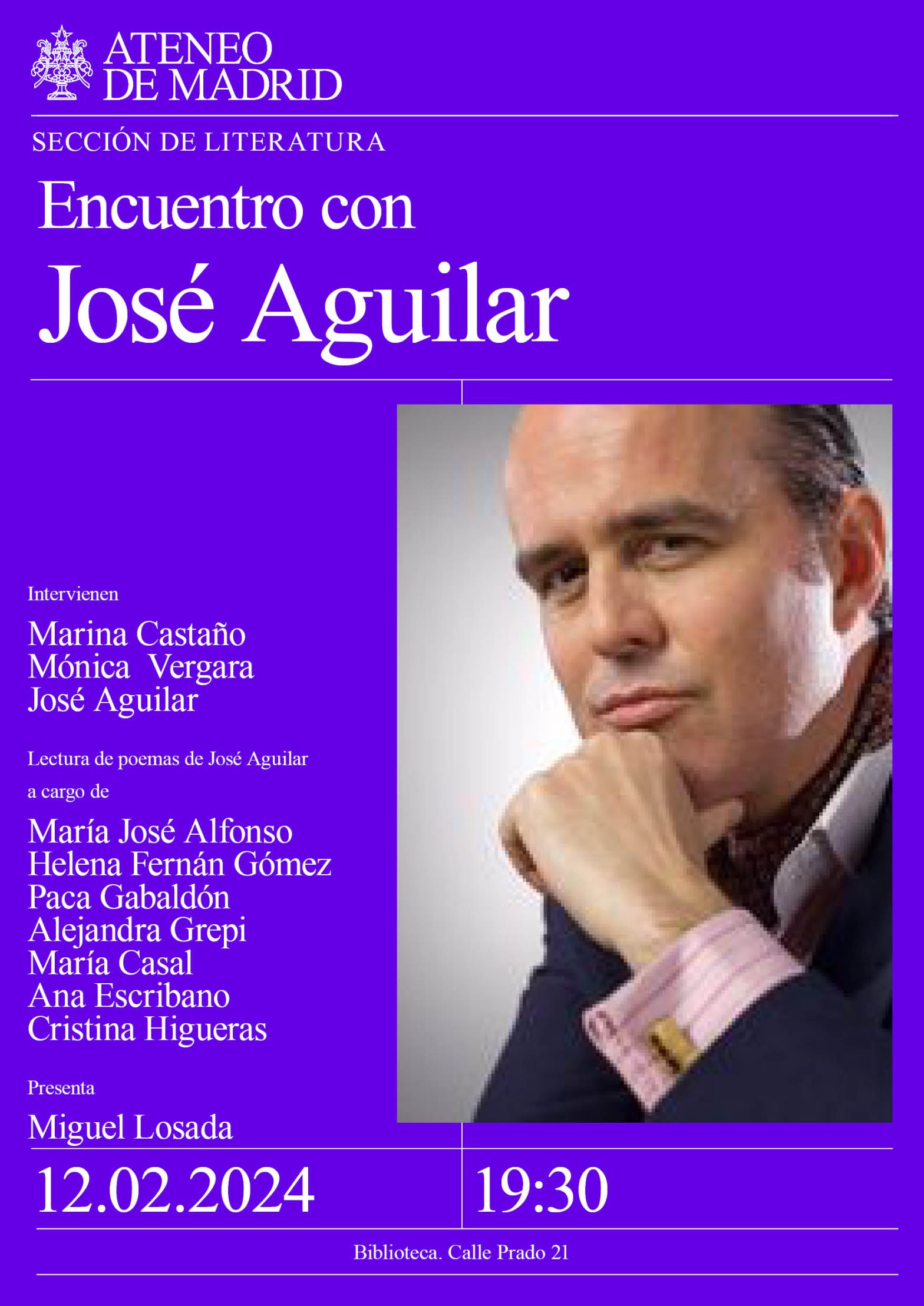 Sección de Literatura. Intervienen: Marina Castaño, Mónica Vergara, periodista en prensa y televisión y José Aguilar. Lectura de poemas de José Aguilar a cargo de María José Alfonso, Helena Fernán Gómez, Paca Gabaldón, Alejandra Grepi, María Casal y Ana Escribano. Presenta: Miguel Losada. Biblioteca. 19:30