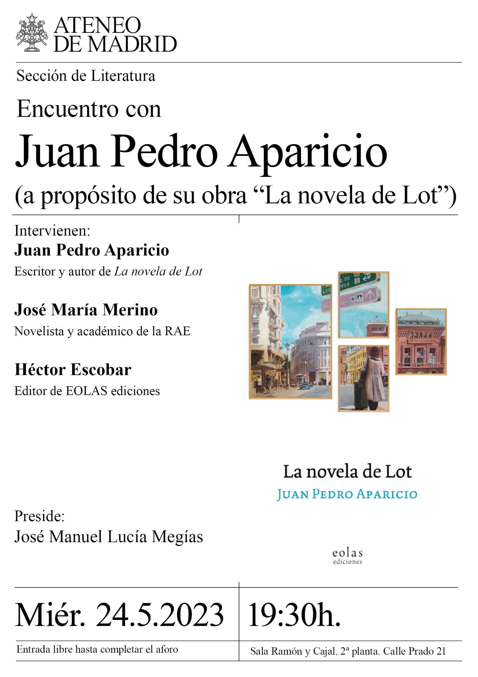 Sección de Literatura. Intervienen: Juan Pedro Aparicio, escritor y autor de La novela de Lot; José María Merino, novelista y Académico de la RAE; Héctor Escobar, editor de EOLAS ediciones. Preside: José Manuel Lucía Megías. Sala Ramón y Cajal. 19:30h.