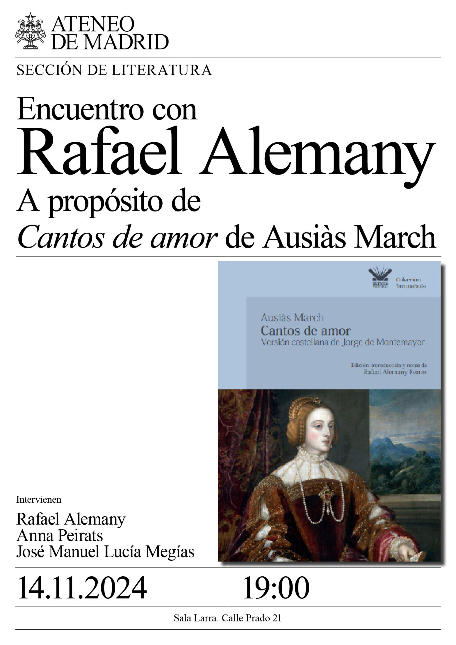 Presentación del libro editado por el profesor Rafael Alemany: Ausiàs March, Cantos de amor. Versión castellana de Jorge de Montemayor, que se acaba de publicar. Una charla alrededor de la literatura catalana medieval y de su difusión e importancia en la Castilla de la época y durante el siglo XVI.