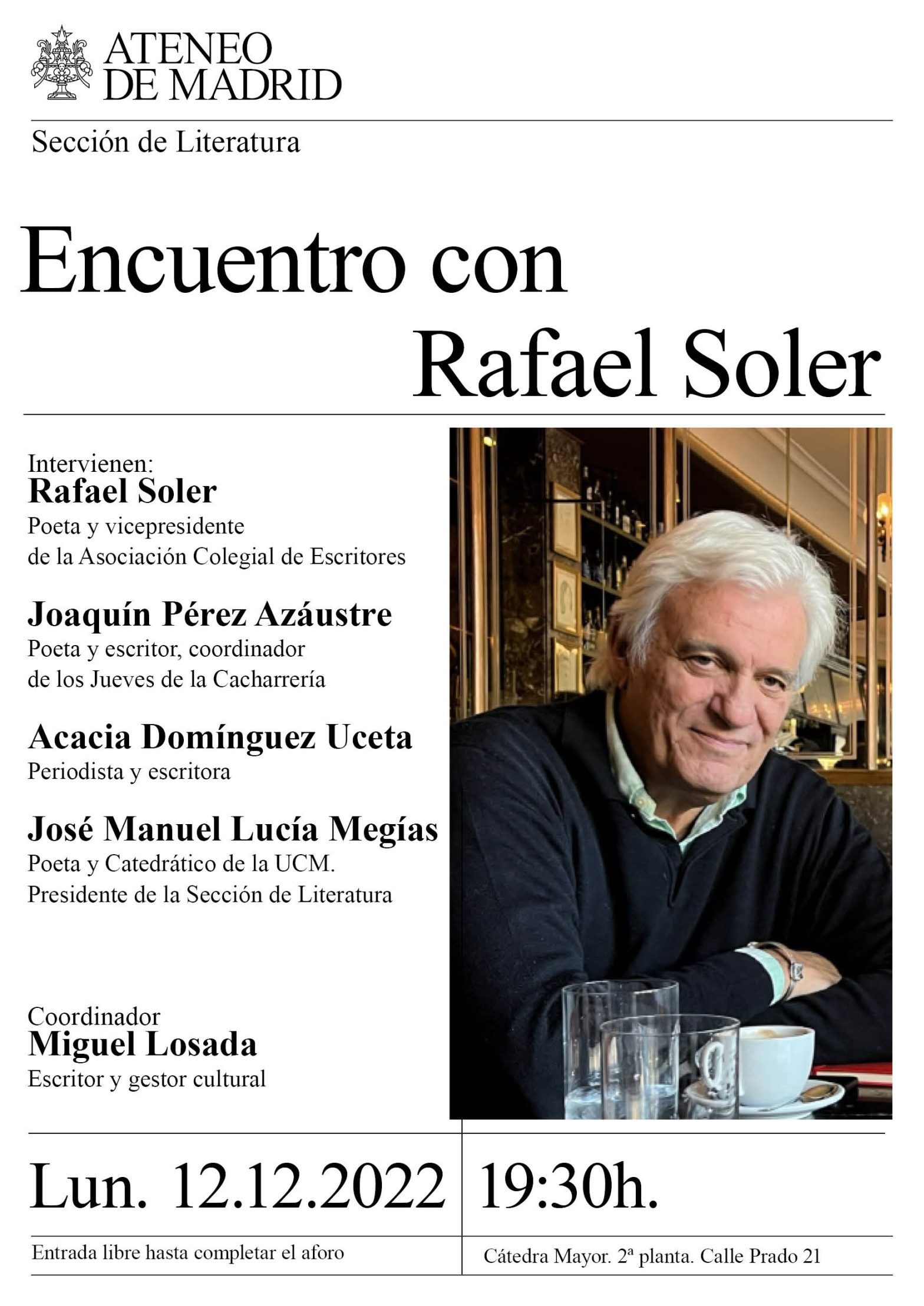 Sección de Literatura. Encuentro con Rafael Soler. Intervienen: Rafael Soler, poeta y vicepresidente de la Asociación Colegial de Escritores, Joaquín Pérez Azáustre, poeta y escritor, coordinador de los Jueves de la Cacharrería, Acacia Domínguez Uceta, periodista y escritora, José Manuel Lucía Megías, poeta y Catedrático de la UCM. Coordinador Miguel Losada. Cátedra Mayor. 19:30h.