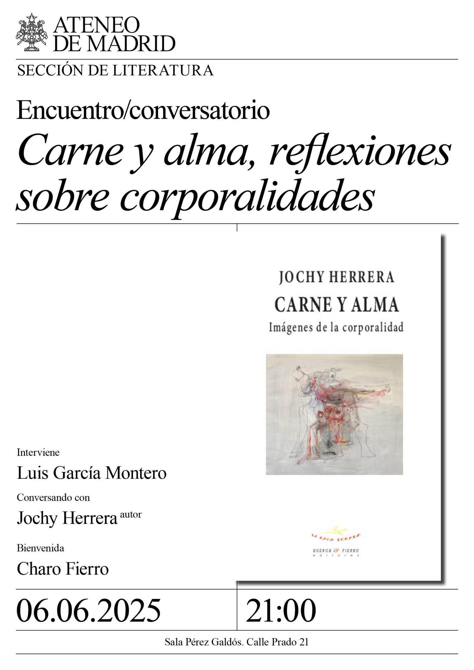Sección de Literatura. Interviene Luis García Montero conversando con Jochy Herrera, autor. Bienvenida Charo Fierro, editora de Huerga & Fierro editores. Sala Pérez Galdós. 21:00h.