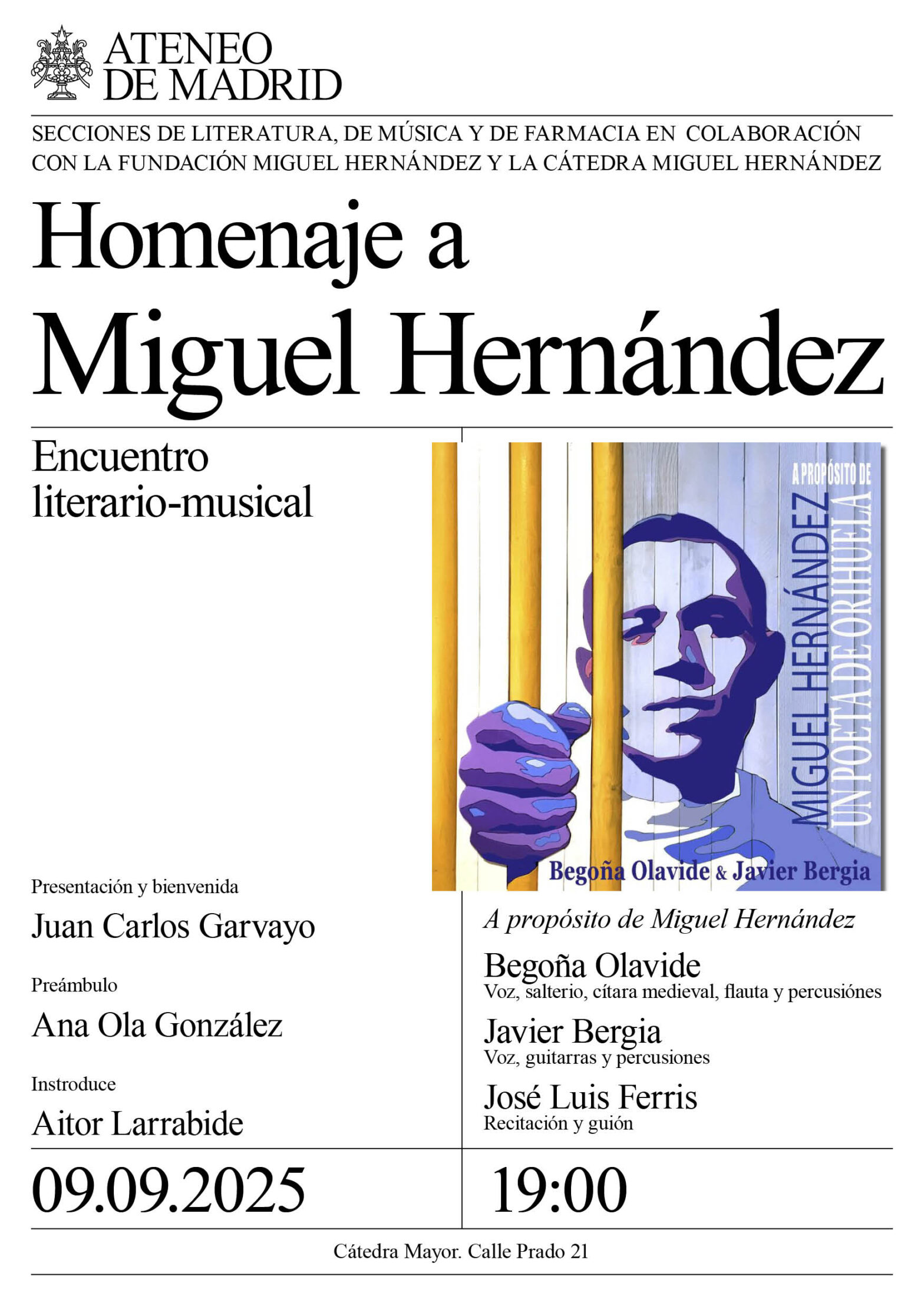 Secciones de Literatura, de Música y de Farmacia en colaboración con la Fundación Miguel Hernández y la Cátedra Miguel Hernández. Presentación y bienvenida: Juan Carlos Garvayo. Preámbulo: Ana Ola González. Introduce: Aitor Larrabide, director de la Fundación Miguel Hernández. A propósito de Miguel Hernández con: Begoña Olavide, voz, salterio, cítara medieval, flauta y percusiones; Javier Bergia, voz, guitarras y percusiones; y José Luis Ferris, recitador. Guion: José Luis Ferris, escritor, biógrafo y director de la Cátedra Miguel Hernández. Cátedra Mayor. 19:00h.