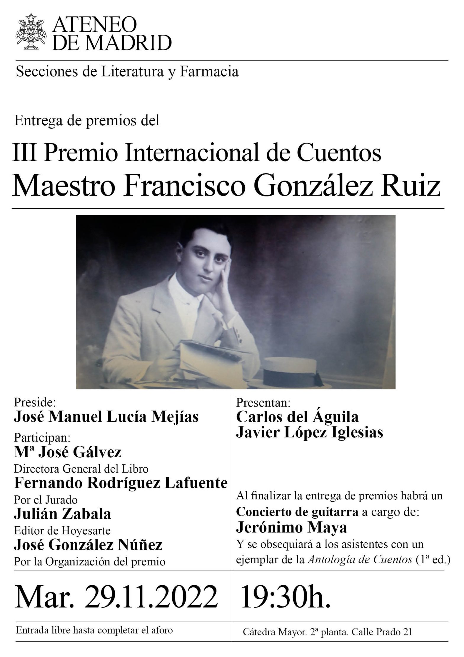 Secciones de Literatura y de Farmacia. Entrega de Premios del III Premio Internacional de Cuentos Maestro Francisco González Ruiz. Preside: José Manuel Lucía Mejías, presidente de la Sección de Literatura. Participan: Mª José Gálvez (Directora General del Libro), Fernando Rodríguez Lafuente (por el Jurado), Julián Zabala (editor de Hoyesarte), José González Núñez, (por la Organización del premio). Presentan: Carlos del Águila y Javier López Iglesias. Al finalizar la entrega de premios habrá un concierto de guitarra a cargo de Jerónimo Maya y se obsequiará a los asistentes con un ejemplar de la Antología de Cuentos (1ª ed.) Sala y hora: Cátedra Mayor. 19:30h.