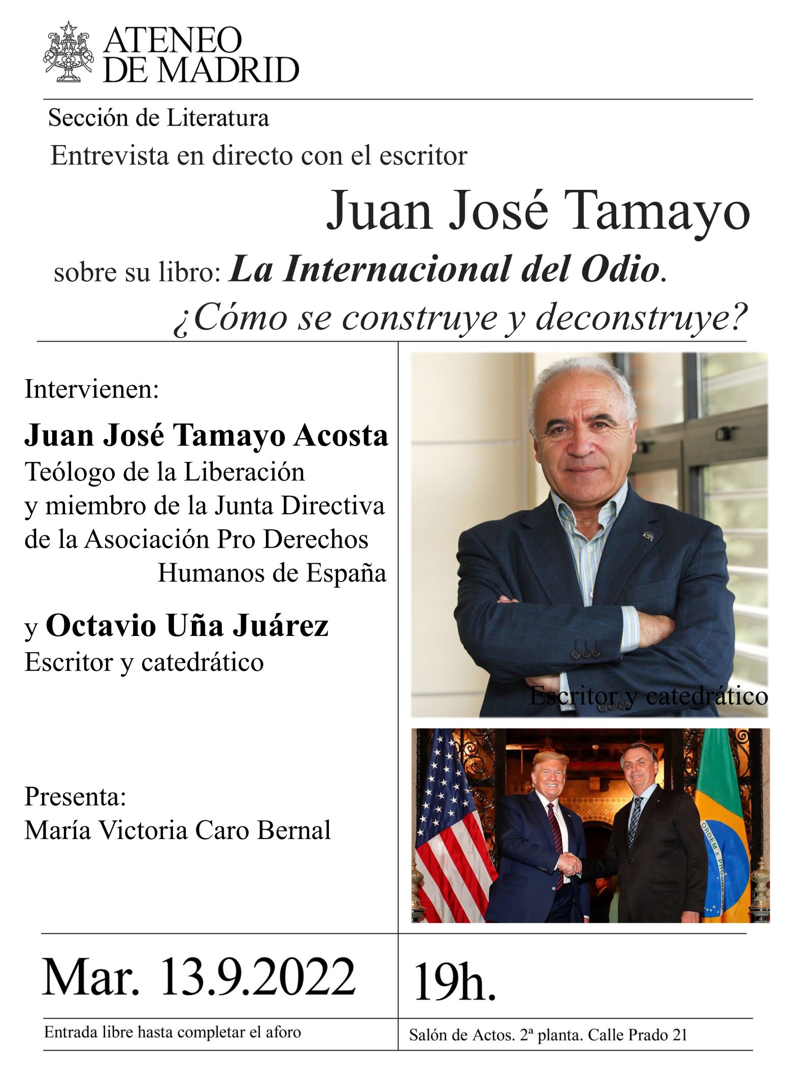 Sección de Literatura. Intervienen: Juan José Tamayo Acosta, teólogo de la Liberación y miembro de la Junta Directiva de la Asociación Pro Derechos Humanos de España, y Octavio Uña Juárez, escritor y catedrático. Presenta: María Victoria Caro Bernal. Salón de Actos. 19h.