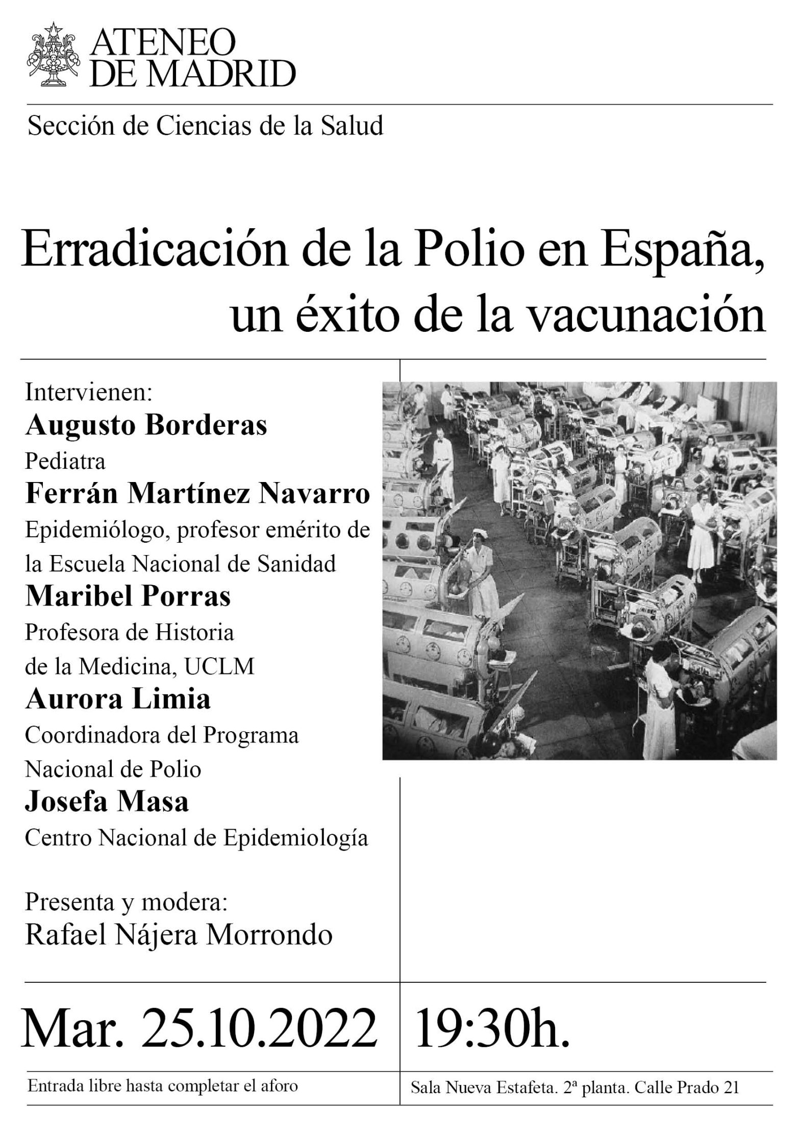 Sección de Ciencias de la Salud. Intervienen: Augusto Borderas, pediatra, Ferrán Martínez Navarro, epidemiólogo, Prof . Emérito de la Escuela Nacional de Sanidad, Maribel Porras, prof. Historia de la Medicina, UCLM, Aurora Limia, Coordinadora del Programa Nacional de Polio. Josefa Masa, Centro Nacional de Epidemiología. Presenta y modera: Rafael Nájera Morrondo. Sala Nueva Estafeta.