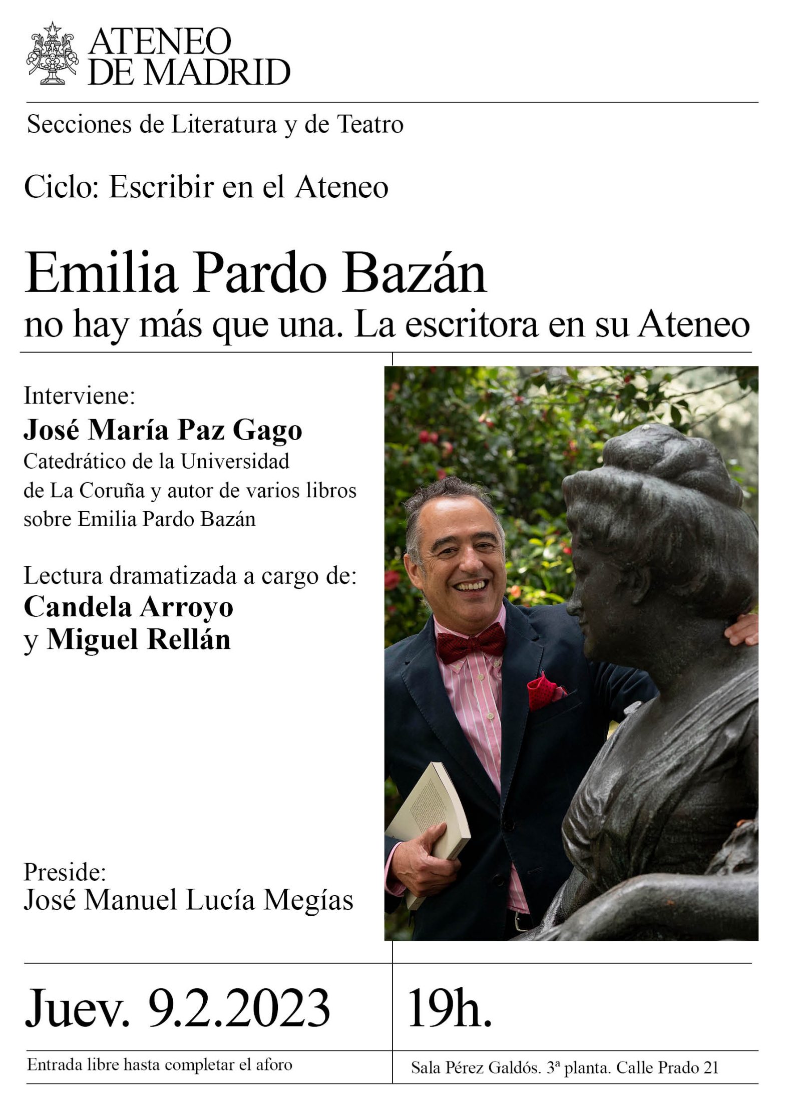 Sección de Literatura. Ciclo Escribir en el Ateneo. Interviene: José María Paz Gago, catedrático de la Universidad de La Coruña y autor de varios libros sobre Emilia Pardo Bazán. Actores: lectura dramatizada de fragmentos. Sala Pérez Galdós. 19h