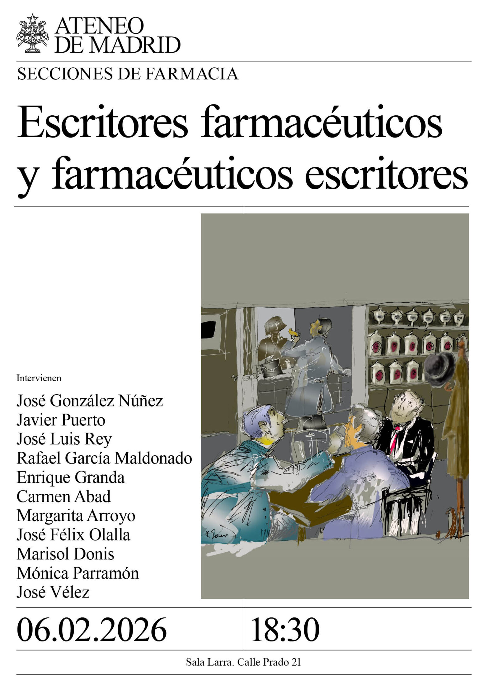 Sección de Farmacia. 1ª parte: De Georg Trakl y Fernando Plata a Rafael García Plata. Intervienen: José González Núñez, Javier Puerto, José Luis Rey, Rafael García Maldonado. 2ª parte Lectura de Textos: Enrique Granda, Carmen Abad, Margarita Arroyo, José Félix Olalla, Marisol Donis, Mónica Parramón y José Vélez. Sala Larra. 18:30h.