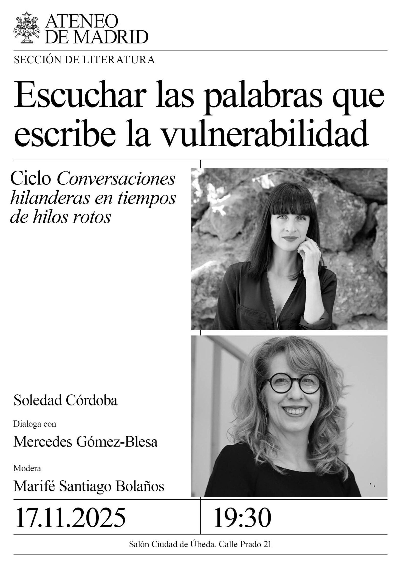 Sección de Literatura. Soledad Córdoba dialoga con Mercedes Gómez-Blesa. Modera: Marifé Santiago Bolaños. Salón Ciudad de Úbeda. 19:30h.