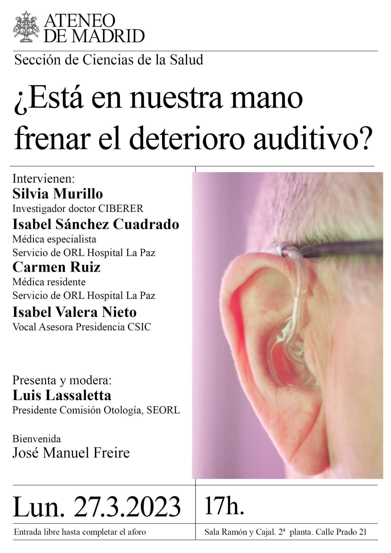 Intervienen: Silvia Murillo, investigador doctor CIBERER; Isabel Sánchez Cuadrado, médica especialista, Servicio de ORL Hospital La Paz; Carmen Ruiz, médica residente, Servicio de ORL Hospital La Paz; Isabel Valera Nieto, vocal Asesora Presidencia CSIC. Presenta y modera: Luis Lassaletta, presidente Comisión Otología, SEORL, Hospital La Paz. Bienvenida al acto: José Manuel Freire. Sala Ramón y Cajal. 17h.