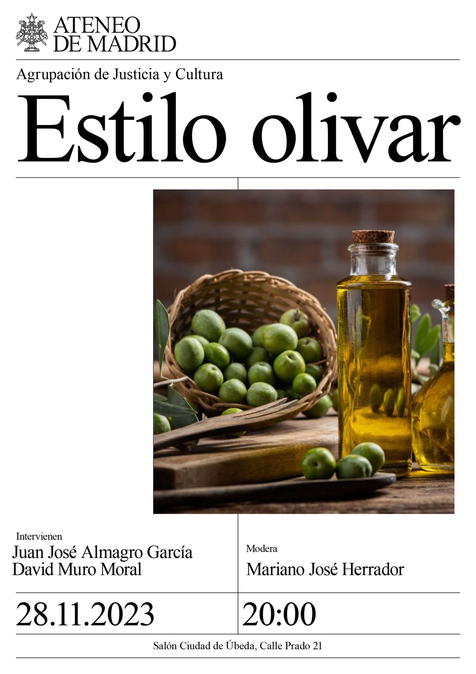 Agrupación Justicia y Cultura. Intervienen: Juan José Almagro García hijo predilecto de Úbeda David Muro Moral biólogo. Maestro de almazara Modera: Mariano José Herrador Guardia. Salón Ciudad de Úbeda. 20:00 h.