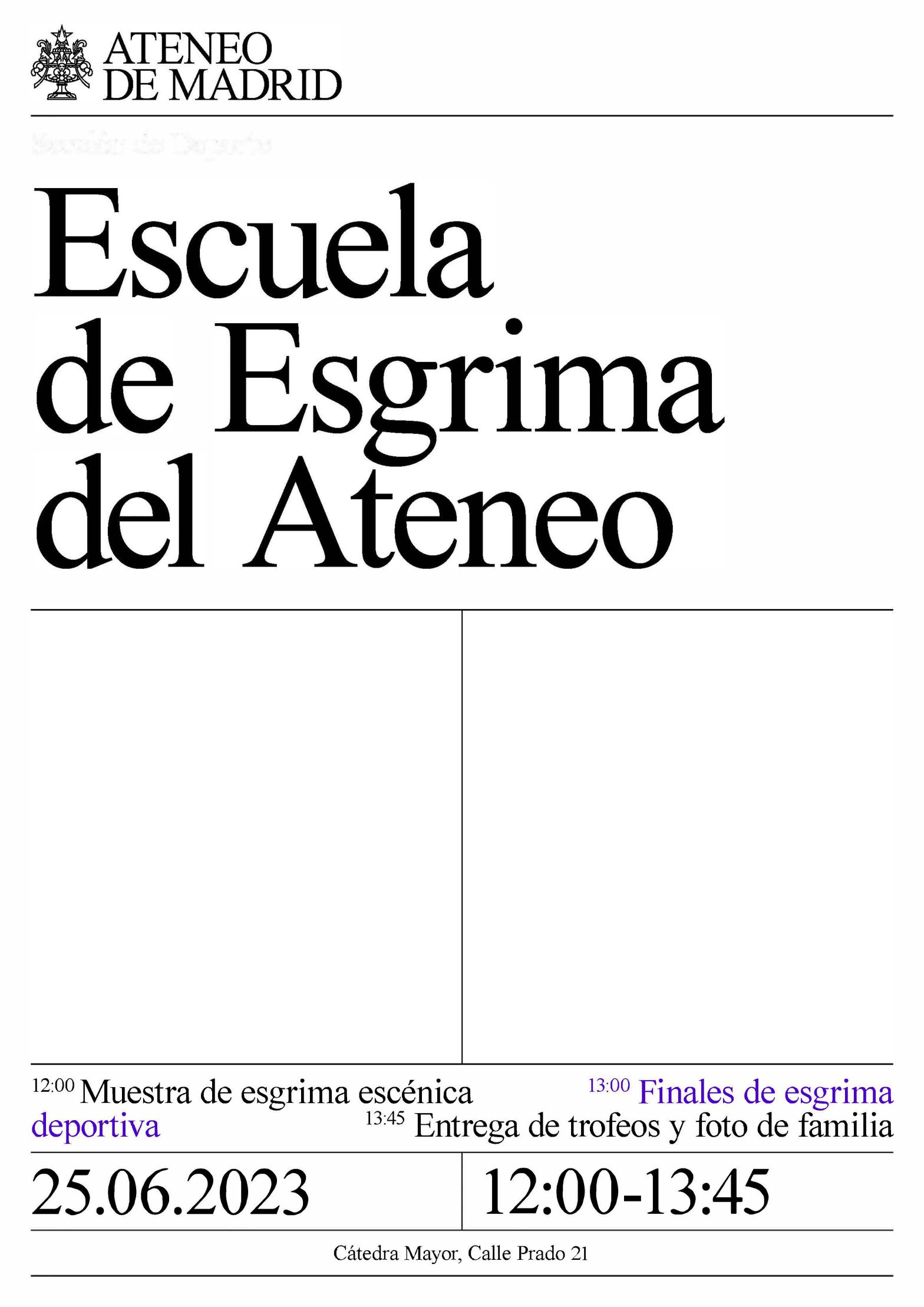 12:00 Muestra de esgrima escénica. 13:00 Finales de esgrima deportiva. 13:45 Entrega de trofeos y foto de familia.