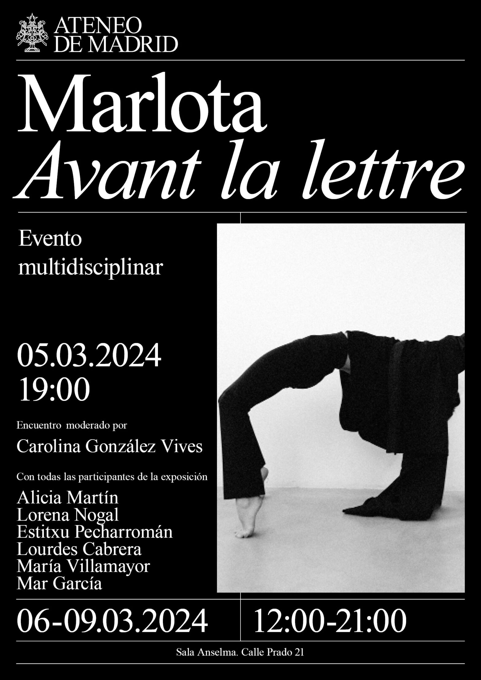 Marlota, comisaría este evento multidisciplinar en el Ateneo de Madrid durante la semana de Arco. A través de la escultura, la danza, las letras y la aguja enhebrada como hilo conductor invitamos a regresar a ese momento y lugar donde nada está todavía escrito. El recorrido espacio-temporal comienza con la pieza escultórica de Alicia Martín en representación de todo lo escrito. Las piezas expuestas de Marlota en las que Estitxu Pecharromán de Ganbara Studio borda las palabras de María Villamayor que dan significado a Avant La Lettre: el silencio que antecede a la palabra, como un intersticio previo al cambio. La creadora e intérprete Lorena Nogal, danzará con esas misma prendas al tiempo que se desprende de ellas. Lourdes Cabrera convertirá en imagen el momento en que todo es posible.