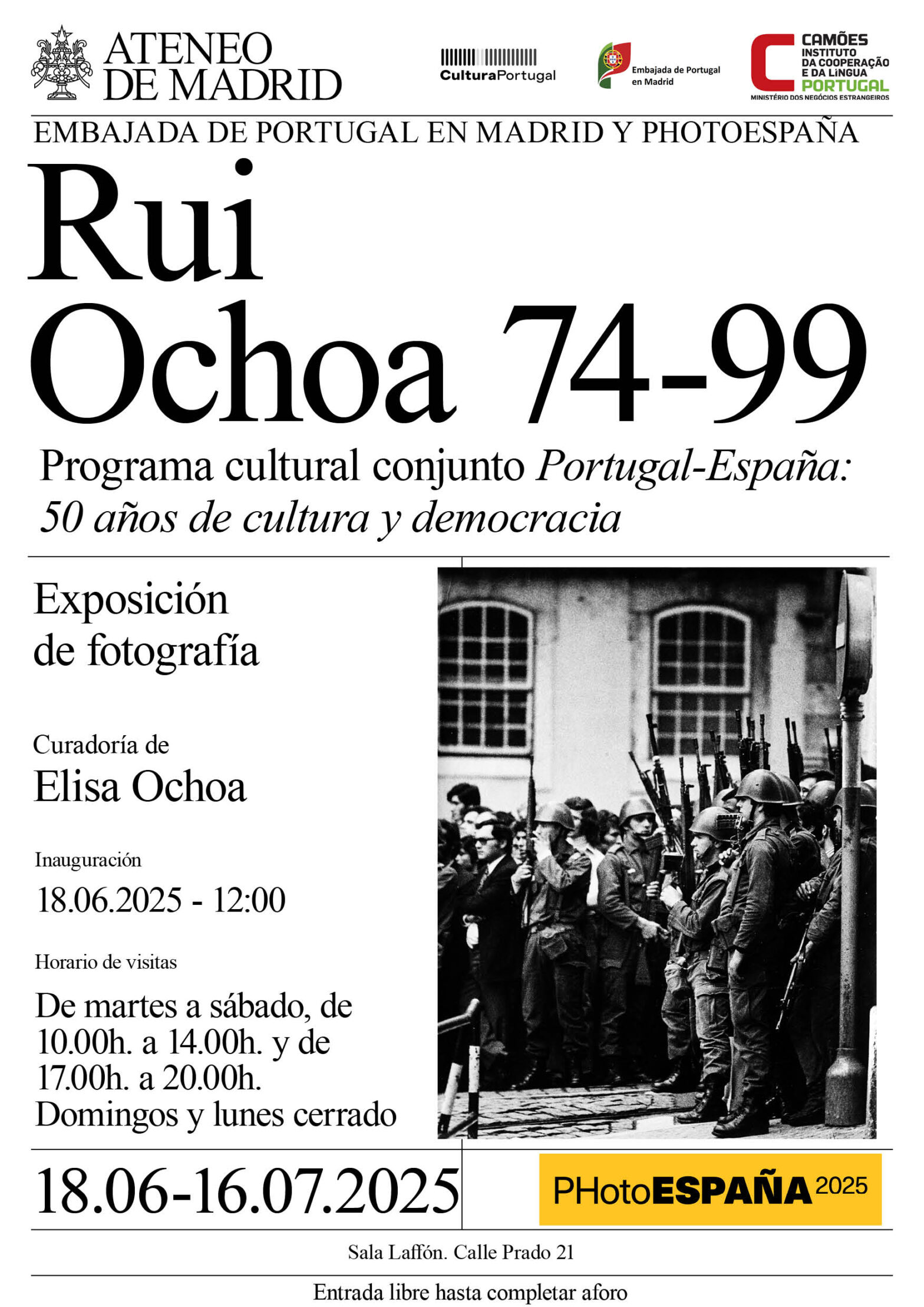 PHotoEspaña 2025La exposición ‘Rui Ochoa: 74-99’ es una iniciativa de la Embajada de Portugal en Madrid, en el marco del Programa Cultural Conjunto ‘Portugal-España: 50 años de Cultura y Democracia’