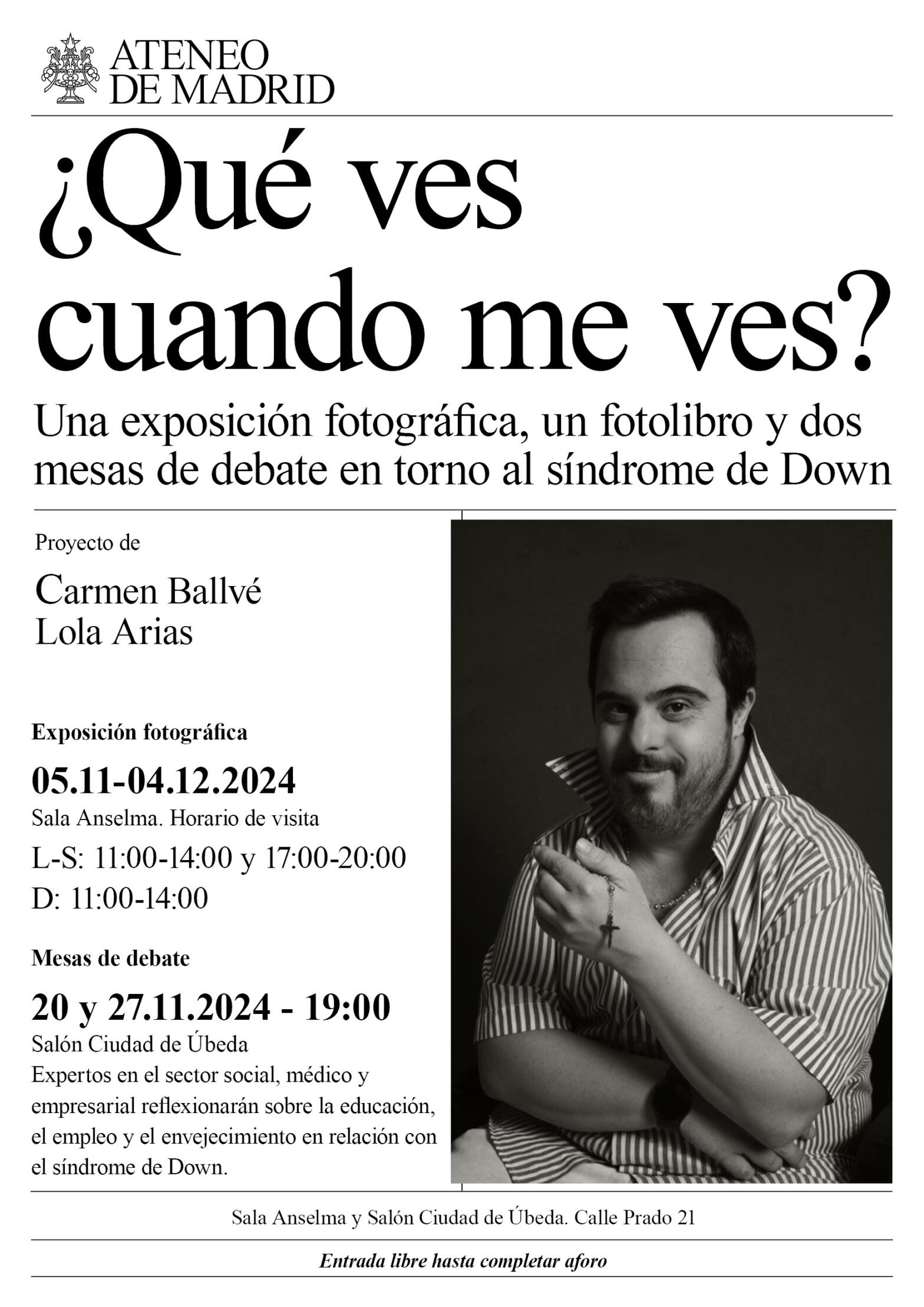 Entrada libre hasta completar aforo. El proyecto ¿Qué ves cuando me ves?, de la fotógrafa Carmen Ballvé y la divulgadora sobre discapacidad intelectual Lola Arias, se presenta en el Ateneo de Madrid mediante sus tres primeras manifestaciones: una exposición fotográfica, un fotolibro y dos mesas de debate (20 y 27 nov.).
