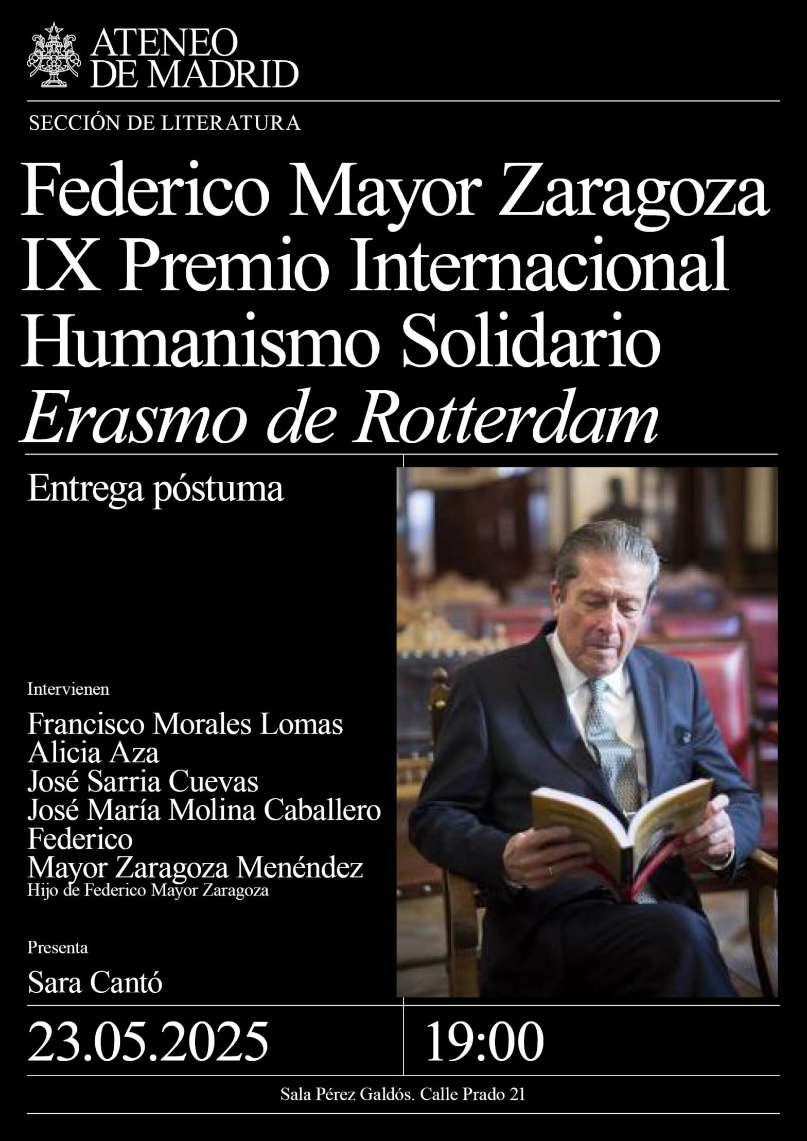 Sección de Literatura. Intervienen: Francisco Morales Lomas, presidente de la Asociación Internacional Humanismo Solidario y presidente de honor de la Asociación Andaluza de Escritores y Críticos Literarios, escritor y profesor de la universidad de Málaga; Alicia Aza, vicepresidenta de la Asociación Internacional Humanismo Solidario, escritora, abogada en ejercicio y miembro de la junta directiva de la Asociación Colegial de Escritores; José Sarria Cuevas, secretario general de la Asociación Internacional Humanismo Solidario y secretario general de la Asociación Colegial de Escritores (Sección Autónoma de Andalucía), escritor; José María Molina Caballero, medalla de Andalucía, fundador y director de la editorial y revista Ánfora Nova, miembro de la Real Academia de Córdoba; y Federico Mayor Zaragoza Menéndez (hijo de Federico Mayor Zaragoza), catedrático de Bioquímica y Biología Molecular, Instituto Universitario de Biología Molecular, Universidad Autónoma de Madrid. Presenta Sara Cantó. Sala Pérez Galdós. 19:00h.